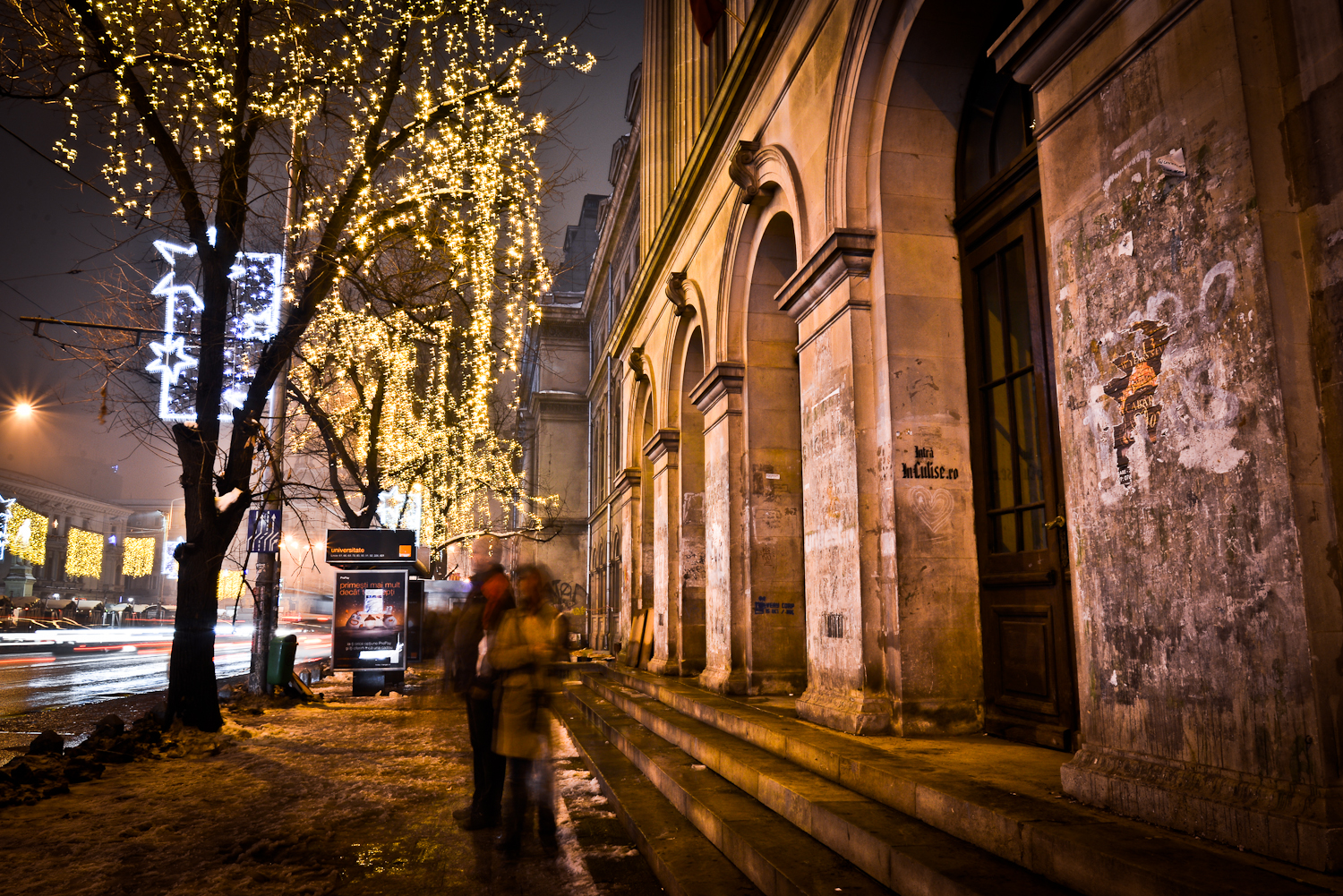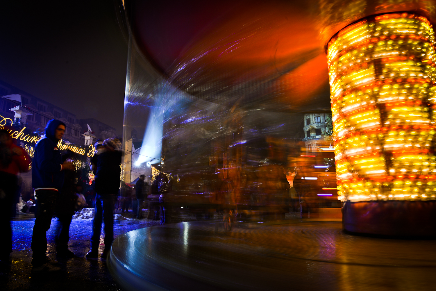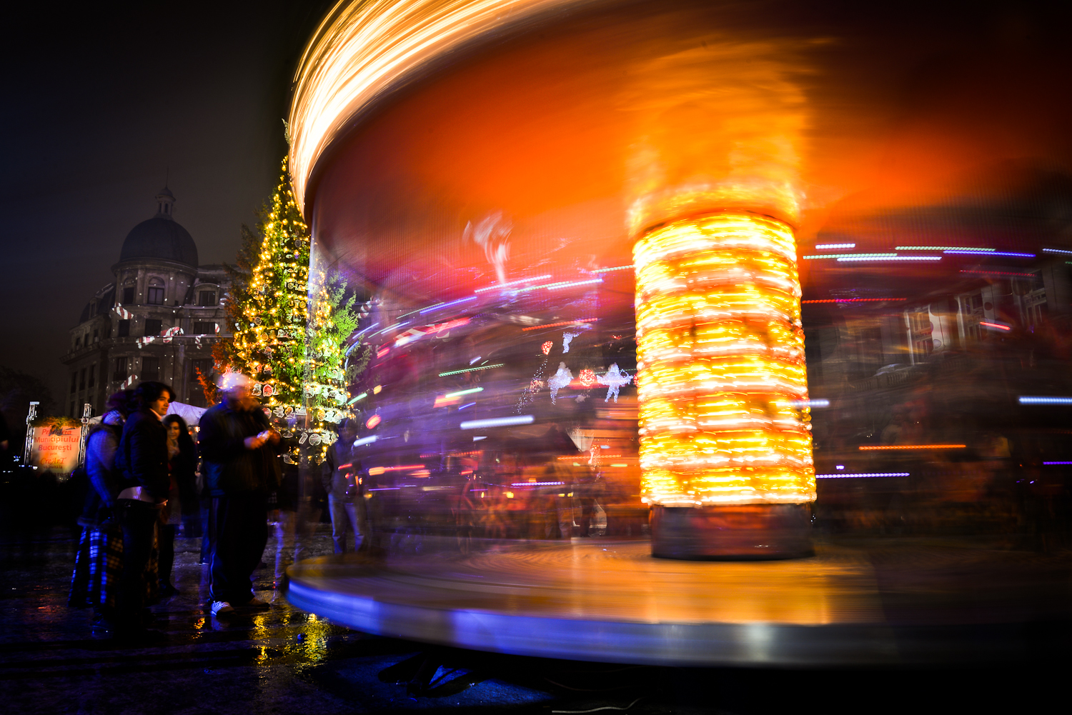 În seara aceasta am fotografiat târgul de Crăciun și zona Universității din București. Îmi doream de mult să fotografiez zona respectivă. Știu, știu că a fost fotografiată de foarte multe persoane. Dar am venit și eu cu perspectiva mea. Am observat că e foarte aglomerat târgul de Crăciun și parcă, nu știu, prea concentrat pe clișee și lucruri clasice regăsite peste tot. Înafară de câteva standuri care sunt, într-un fel sau altul, autentice, nu prea ai ce să vezi.