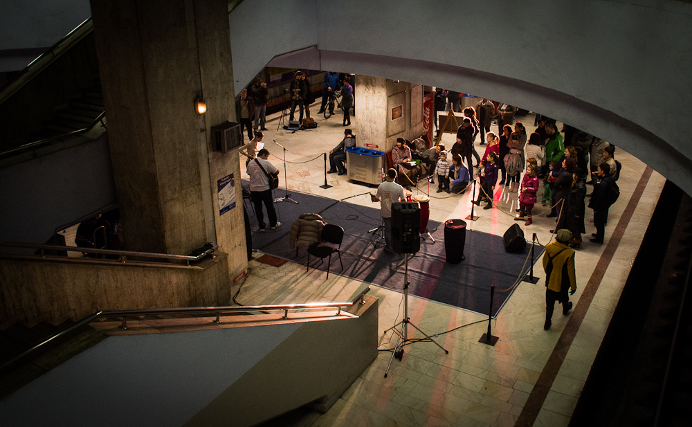 Așa cum probabil ați citit pe Facebook, în weekend Acoustic Bloggers au cântat la metroul de la Unirii și Universitate. Vă spun de pe acum că pentru mine să faci ceva în genul ăsta, adică să cânți, să fotografiezi, să faci un spectacol LA METROU e ceva așa, wow. Poate vă veți întreba de ce și veți râde. În urmă cu un an am avut o experiență tare neplăcută când un paznic de la metrou a avut grijă să-mi lovească aparatul foto pentru că făceam fotografii înăuntru. Și la cât de evident e semnul cu fotografiatul interzis… În fine.