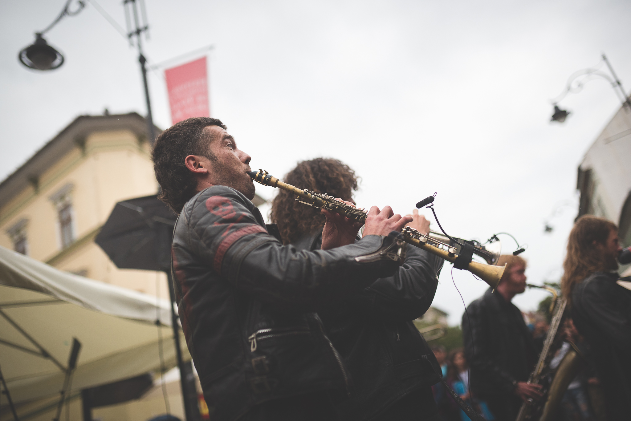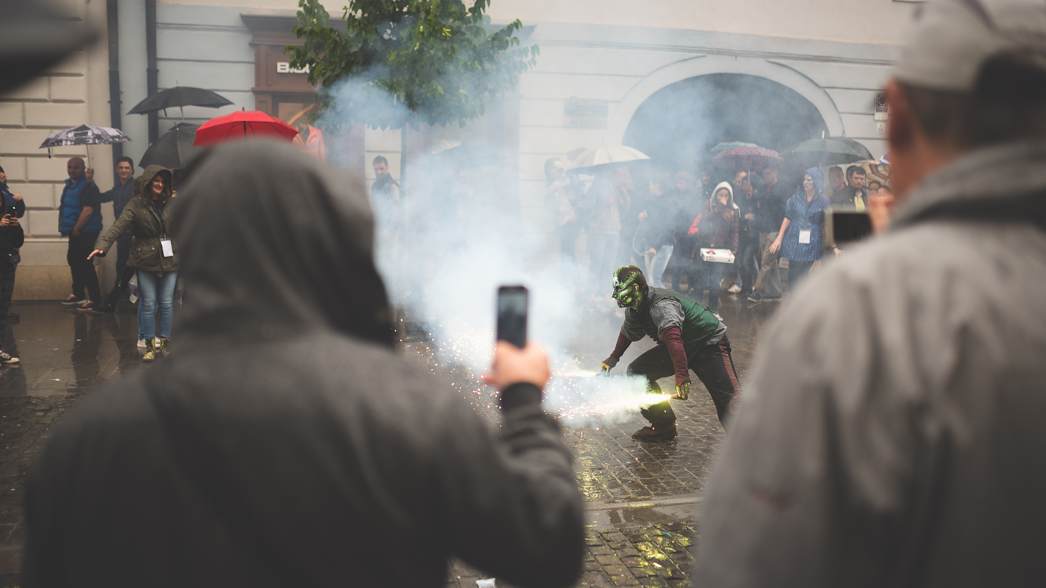 Am mai văzut și fotografiat pe parcursul celor trei zile încă o serie tare faină de astfel de spectacole stradale. Mi-a plăcut mult cum, chiar dacă vremea n-a fost cea mai prietenoasă, actorii și-au continuat jocul, iar publicul a rămas acolo, în fața loc, privind de sub umbrele. Cred că-i un efort uriaș, mai ales dacă-i vorba de acrobații unde depinzi de o suprafață uscată ori de dans, unde „uniforma” trebuie să arate ca atare.
