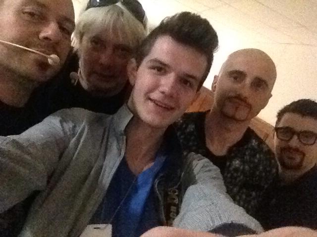 Pe la ora 19:15 am intrat în Sala Polivalentă. Am întrebat în stânga și-n dreapta unde-s băieții din trupă. Voiam să-i fotografiez înainte să urce pe scenă, doar că m-am cam rătăcit prin holurile și toate părțile sălii. După alte câteva minute i-am găsit și primul gând a fost să facem un selfie. Atunci i-am cunoscut pe toți membrii trupei: Oliver, Valeriu, Gabriel și Adi. Tare fericit am mai fost – și încă sunt – c-am făcut fotografia aceasta. 🙂 Scuzați-i calitatea, dar am făcut-o rapid cu telefonul.