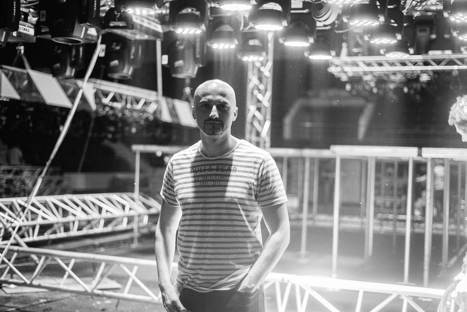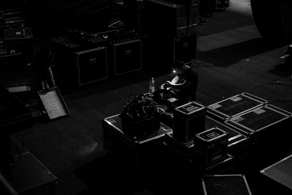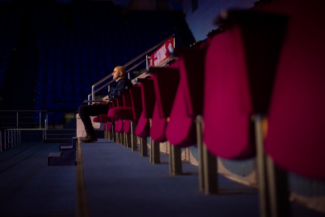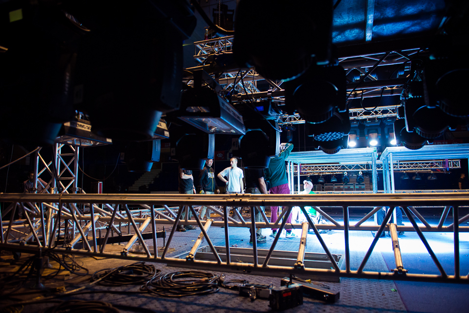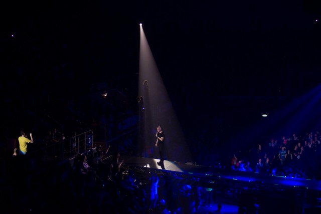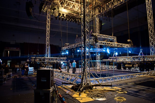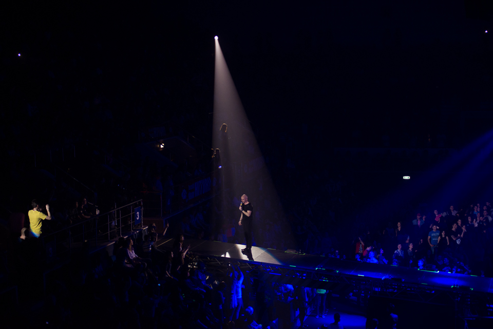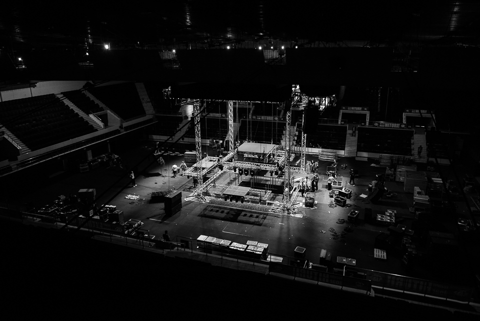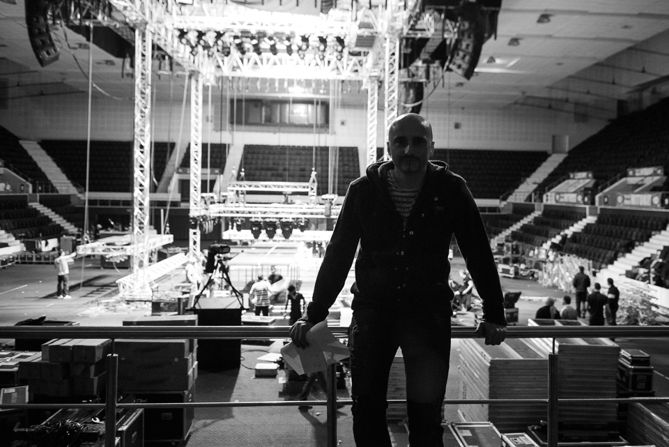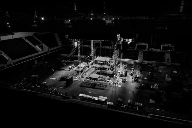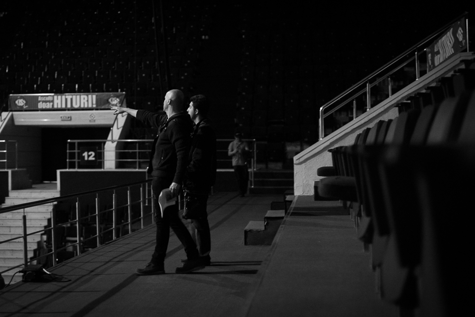 Și acum să revenim la întâlnirea cu Călin. Am ajuns miercuri, cu o zi înainte de concert, la Sala Polivalentă să încep acest fotoreportaj prin câteva fotografii de la pregătiri. Am rămas surprins de desfășurarea de forțe: lumini aduse din Olanda, segways, scene care urmau să se suprapună și așa mai departe.