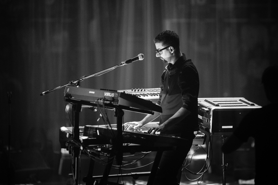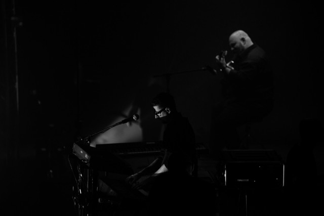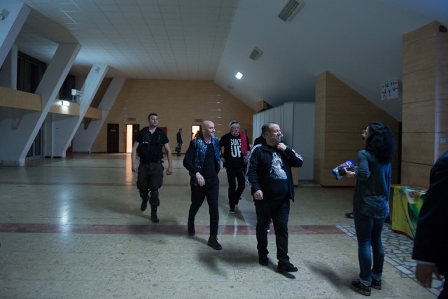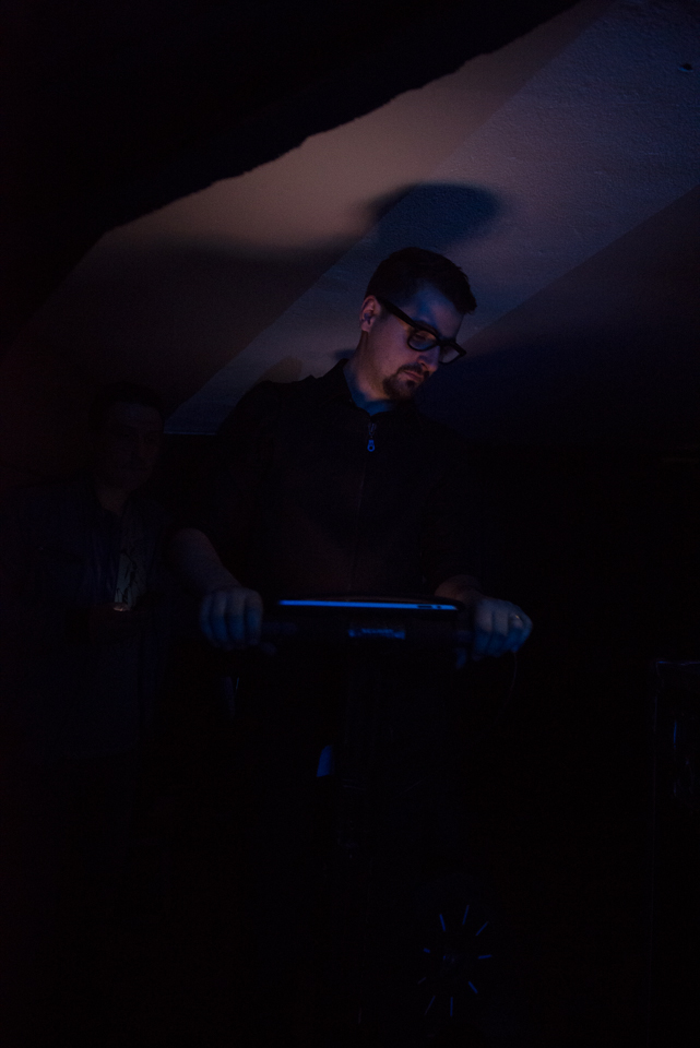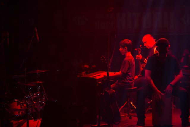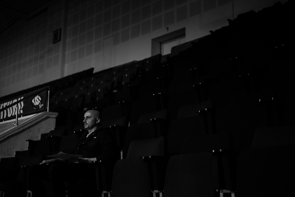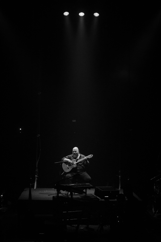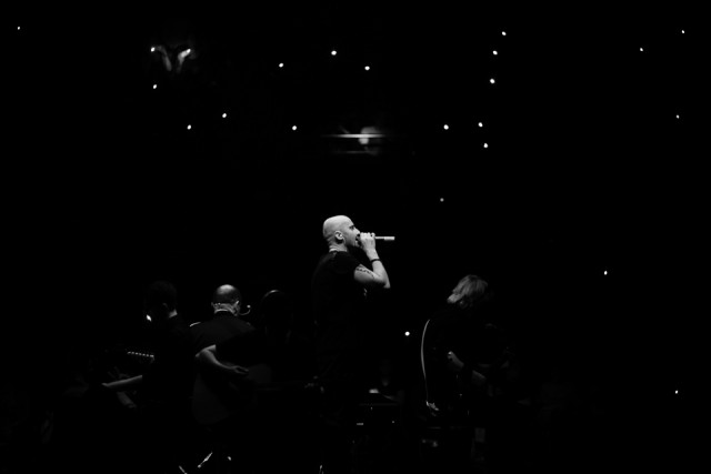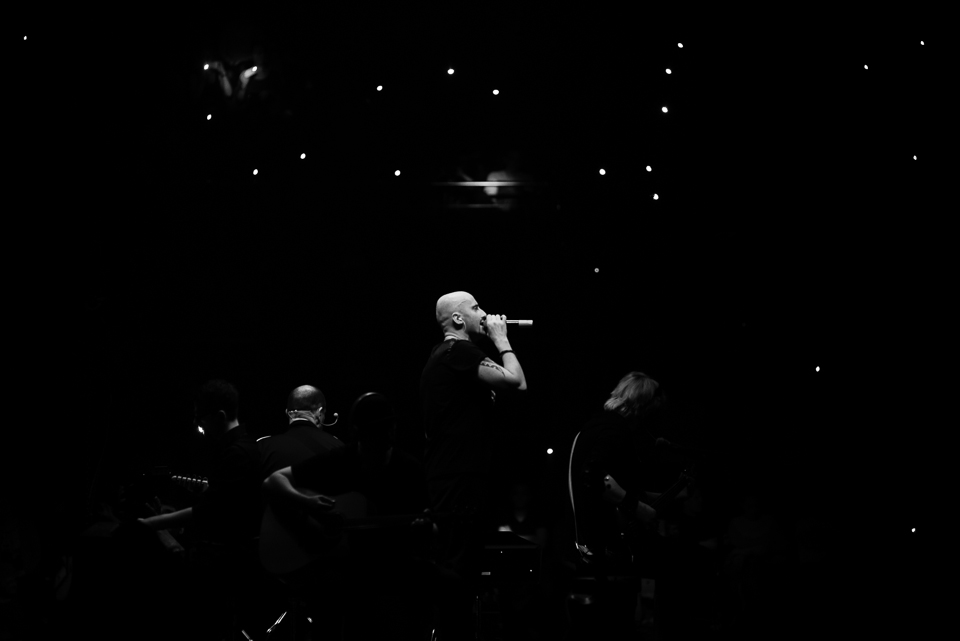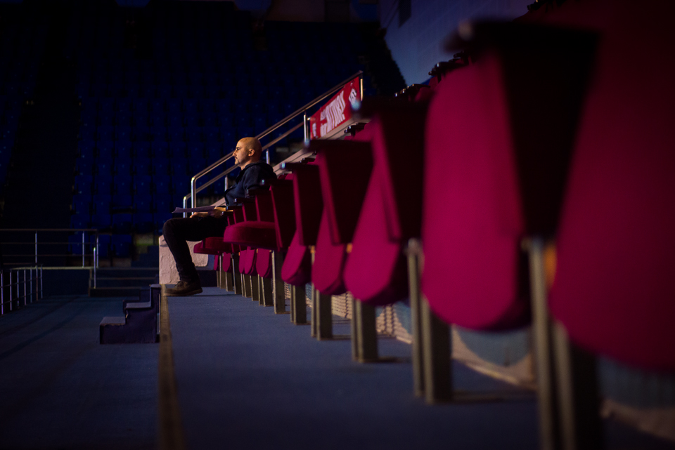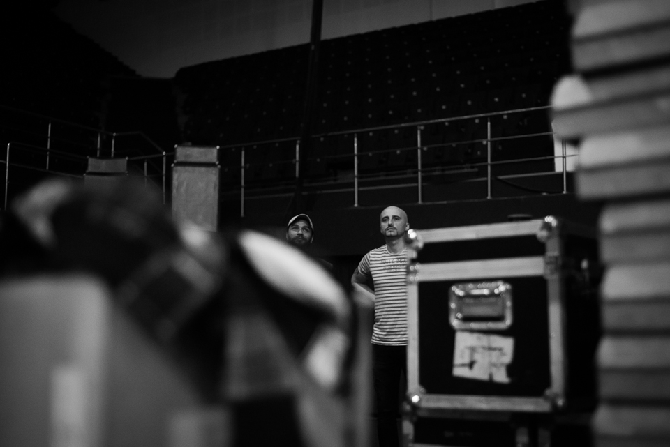 Am început să fotografiez așa, spațiul, să mă obișnuiesc și să știu apoi ce să urmăresc. Cât timp făceam fotografiile astea mă uitam cu coada ochiului după Călin. Voiam să-l fotografiez pe Călin – în momentul acela doar el ajunsese din trupă – doar că așteptam un moment prielnic, dar cât mai natural. Partea bună e că atunci când am întors capul l-am văzut în public, stând pe scaune sau plimbându-se printre ele. Repeta scenariul pentru concert, dar era foarte atent în același timp la ce se întâmpla pe scenă.