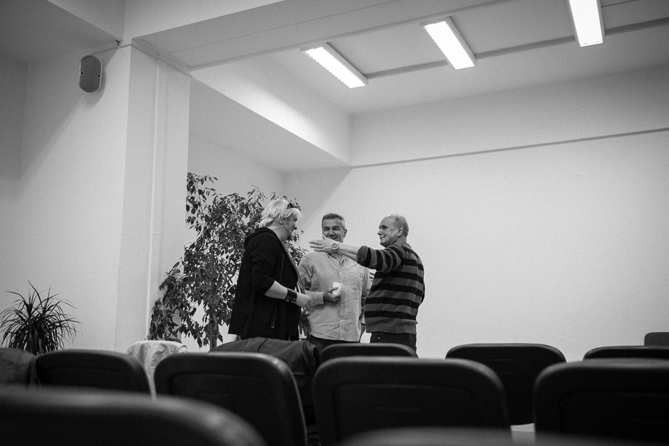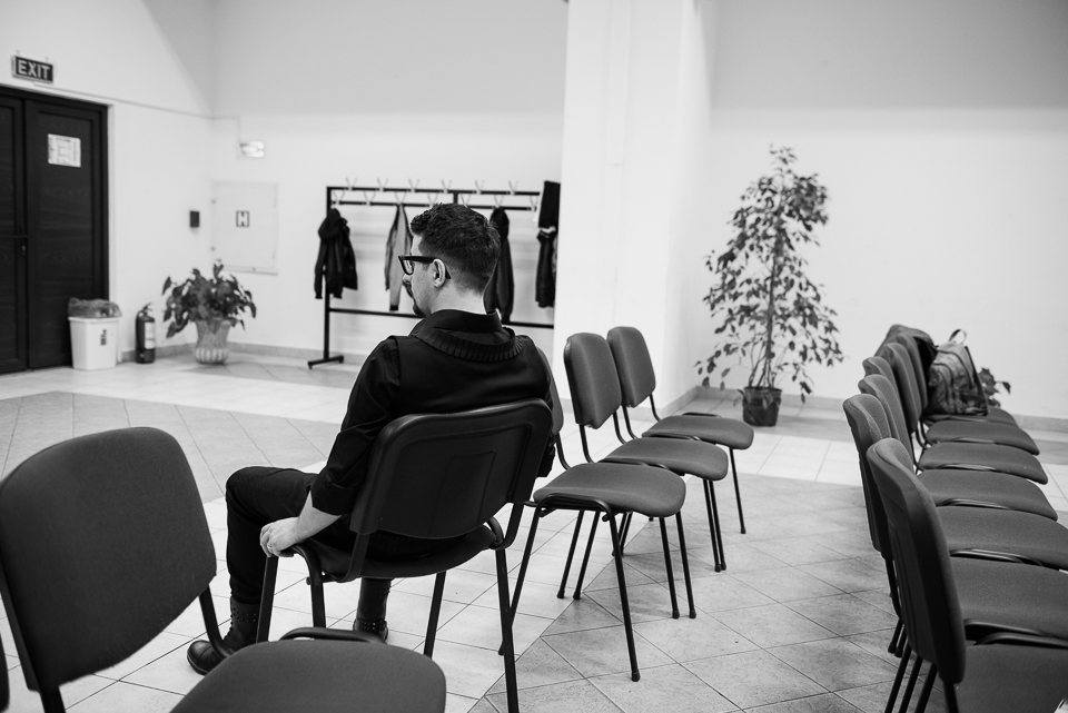 „Începem la 19:45”, îl aud pe Călin spunând la telefon. „Mai sunt oameni încă afară? Să-i așteptăm, să nu începem fără ei!”.