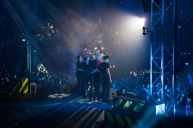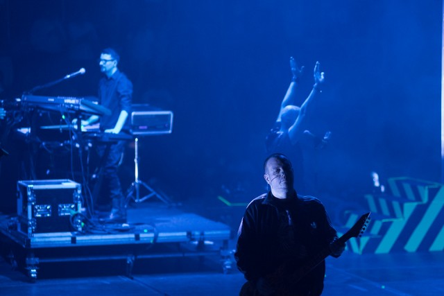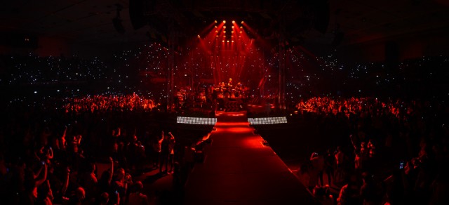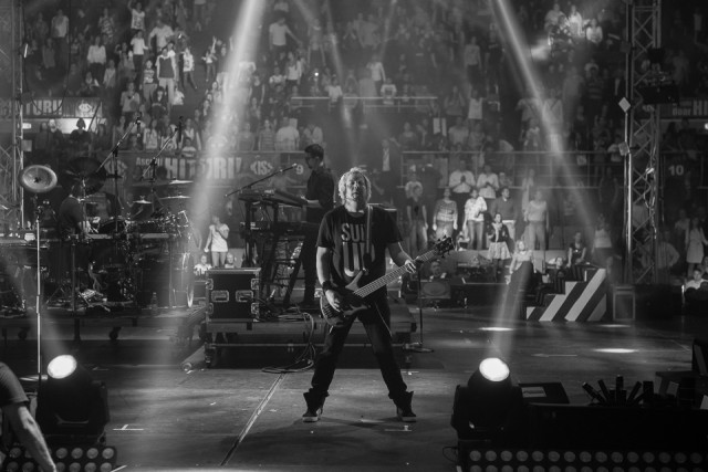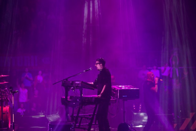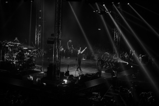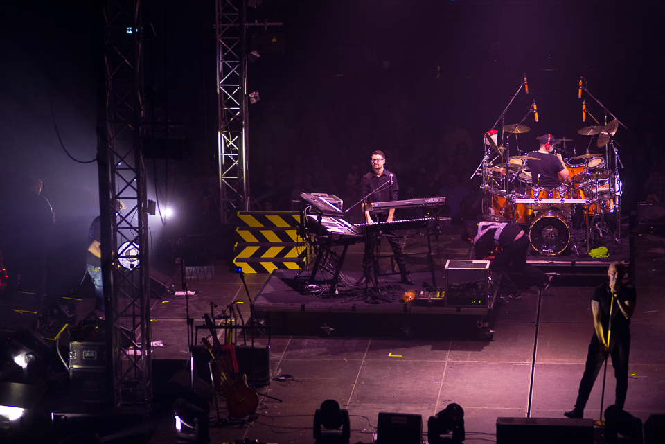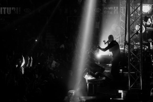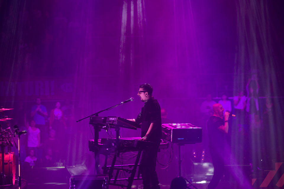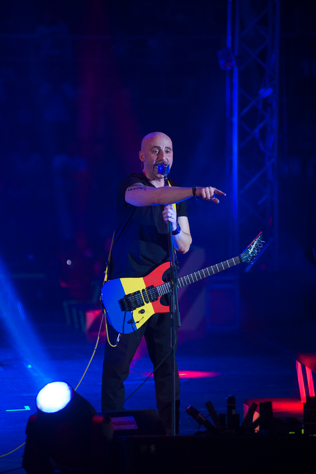 Și a început spectacolul. Să vă uitați atenți la fotografii. Unul dintre microfoanele lui Călin are un GoPro montat care filmează publicul, iar ceilalți membri ai trupei stau pe platforme care din când în când se mișcă și își schimbă pozițiile între ele.