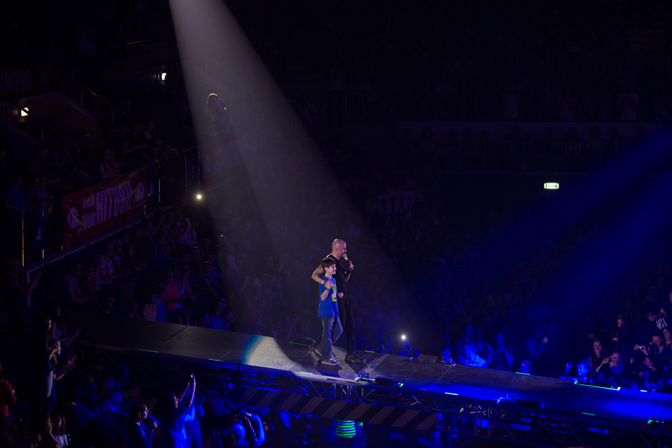 „… ne-am întâlnit cu George la un concert la mare. În momentul ăla, știind că George cântă la pian de aproape trei ani, i-am zis ca să-i văd, să-i aduc un zâmbet pe față: Uite, îți promit, că la un moment dat, într-un concert de-al nostru, unul mare, așa, cu multă lume – și aici începe să-i tremure vocea lui Călin – o să te chemăm să cânți alături de noi. El a zis: nu cred, nu creeed. I-am zis: crede, crede! Și uite, George, ăsta e momentul pe care ți l-am promis. El este George Andrei, are aproape 12 ani, un luptător și un model de urmat pentru toți. Și vrem să cântăm împreună o melodie.”