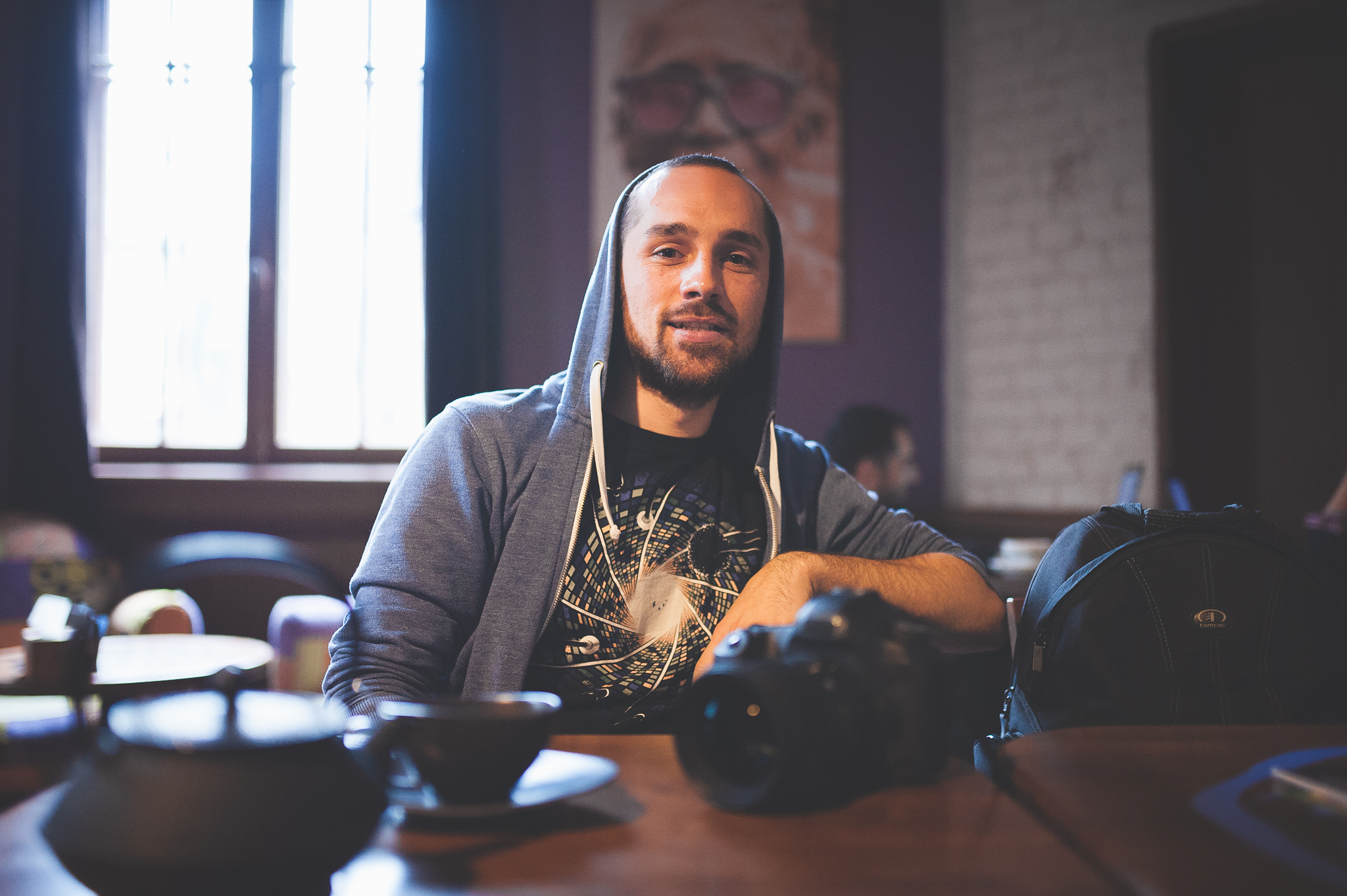 Exact după cuvintele astea m-a invitat să încercăm să facem un experiment. Exact așa cum are el de gând să facă fotografiile. În cadrele pe care le vedeți l-am fotografiat pe Cristian în timp ce mă fotografia pe mine. Dacă v-arăt fotografia pe care mi-a făcut-o veți ghici despre ce va fi seria, așa că am să fac asta după vernisaj. Cert e că toată treaba-i extrem de dinamică și implică muncă din partea ambelor părți.