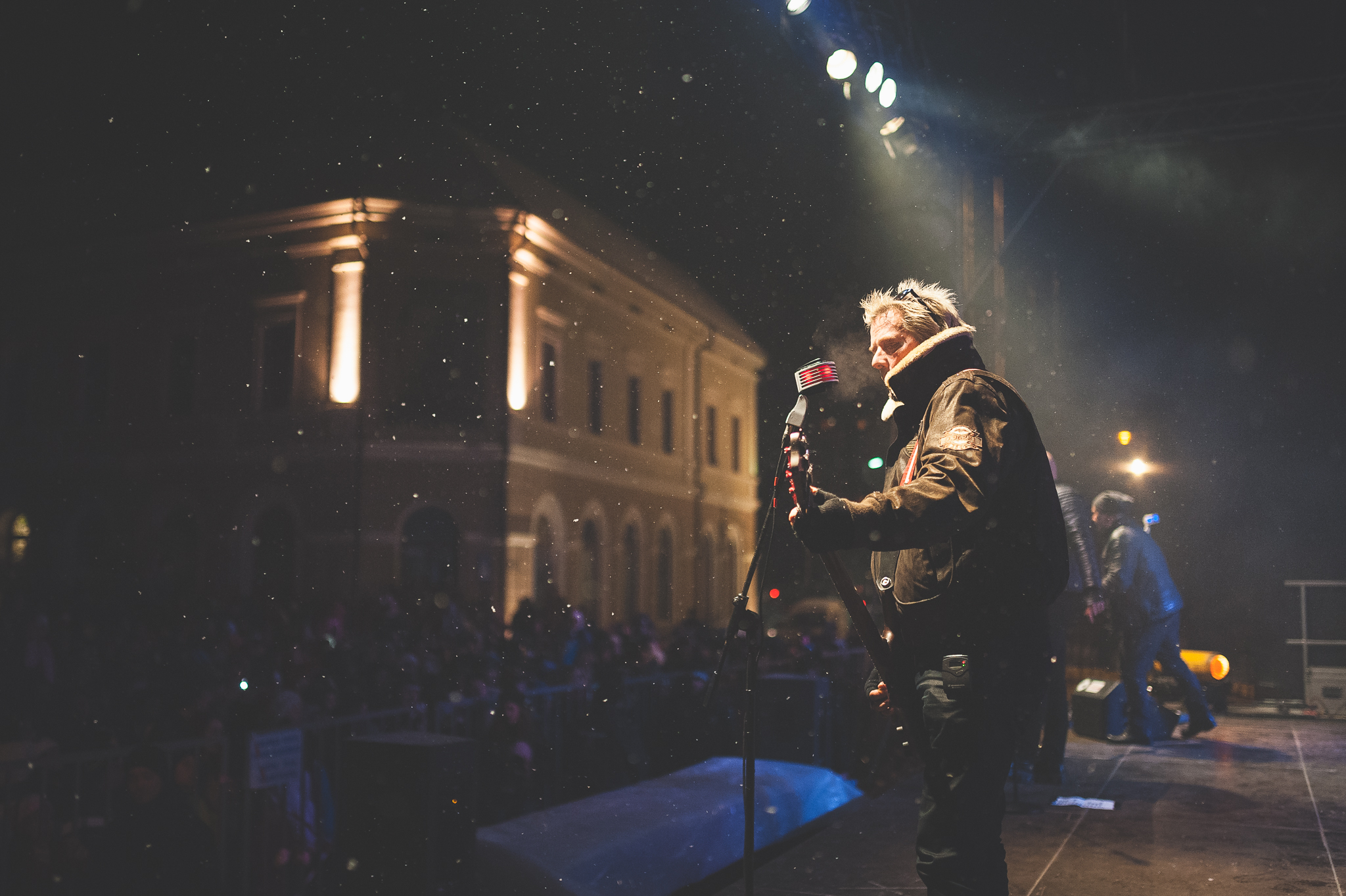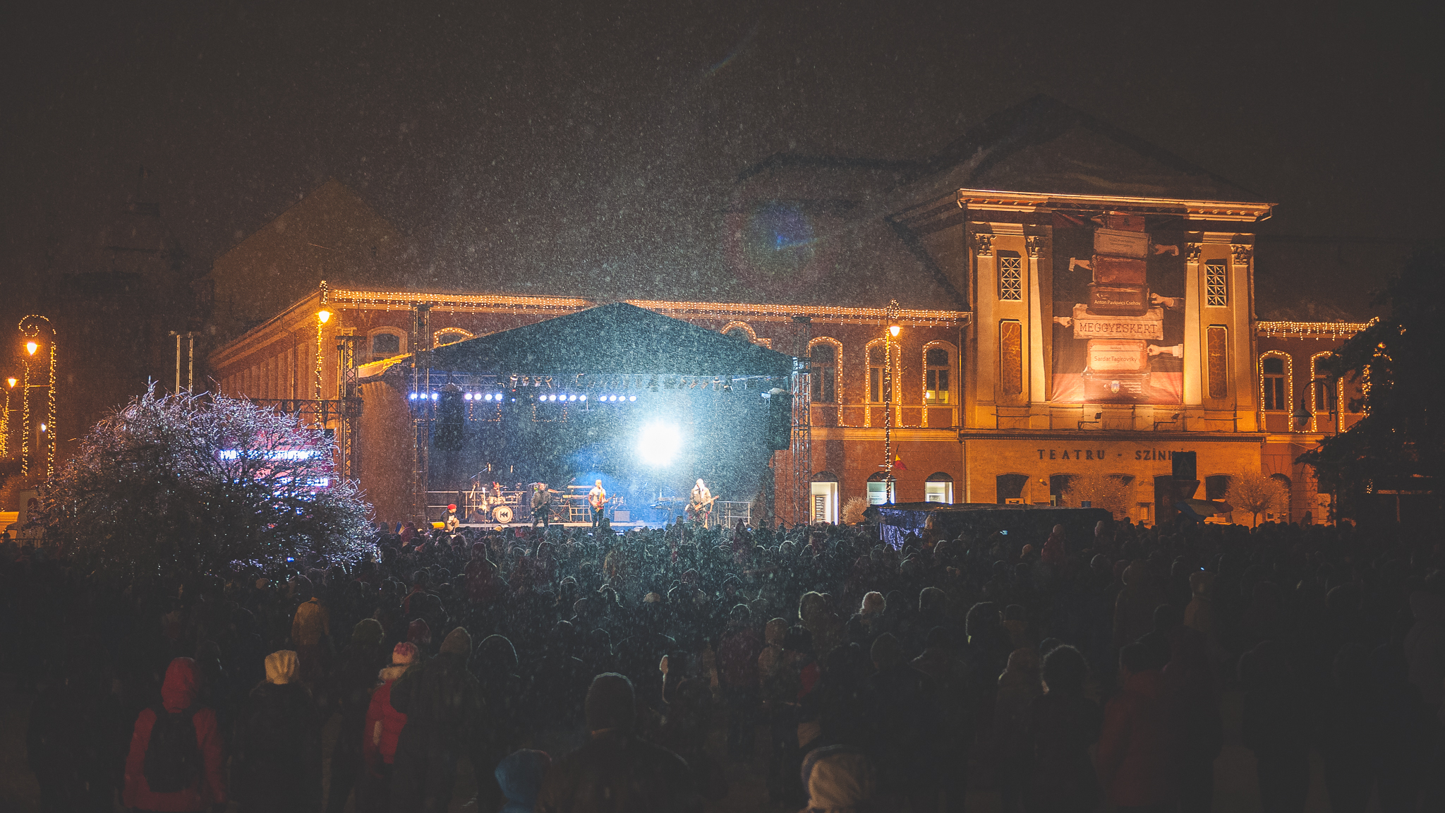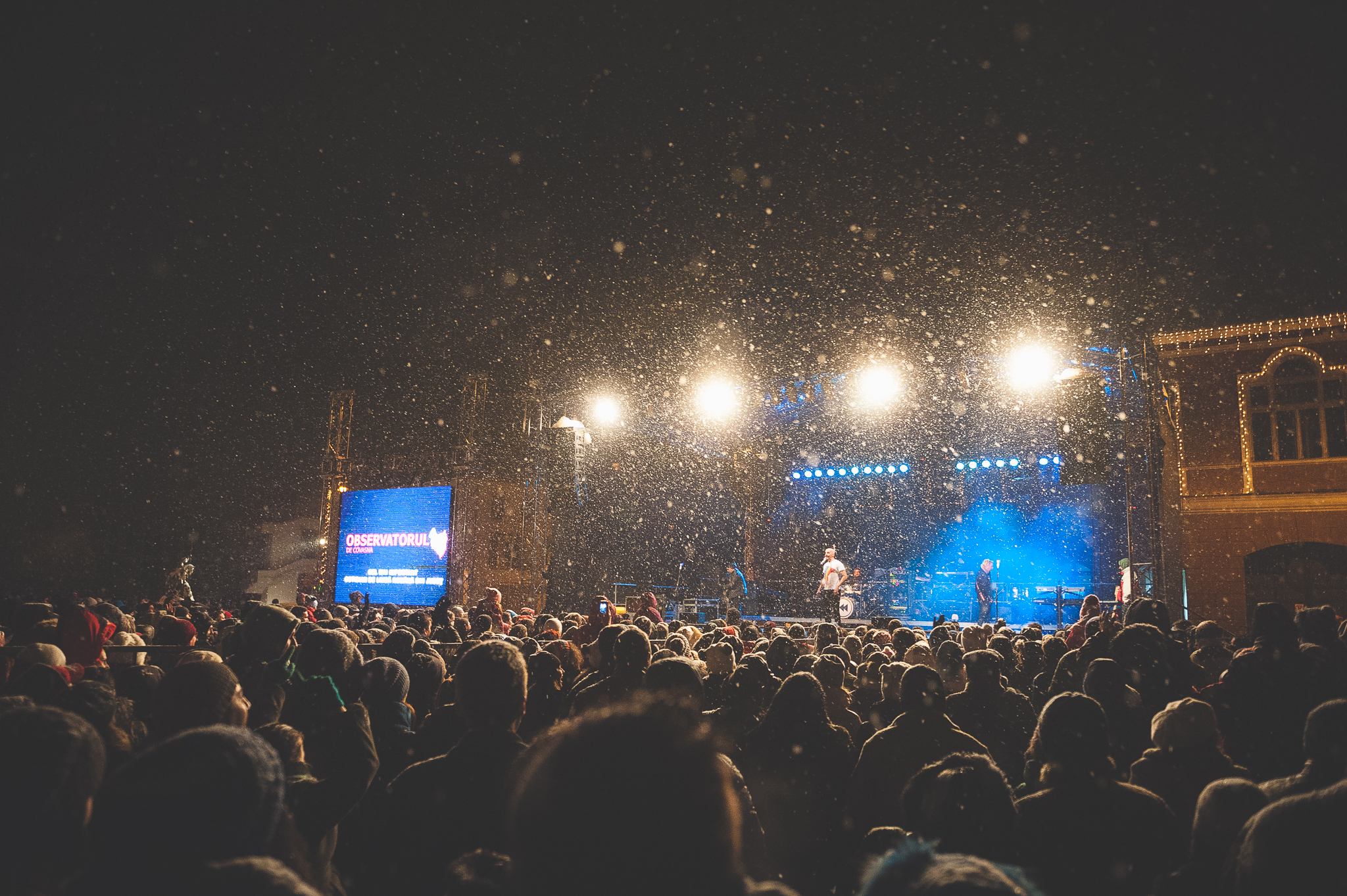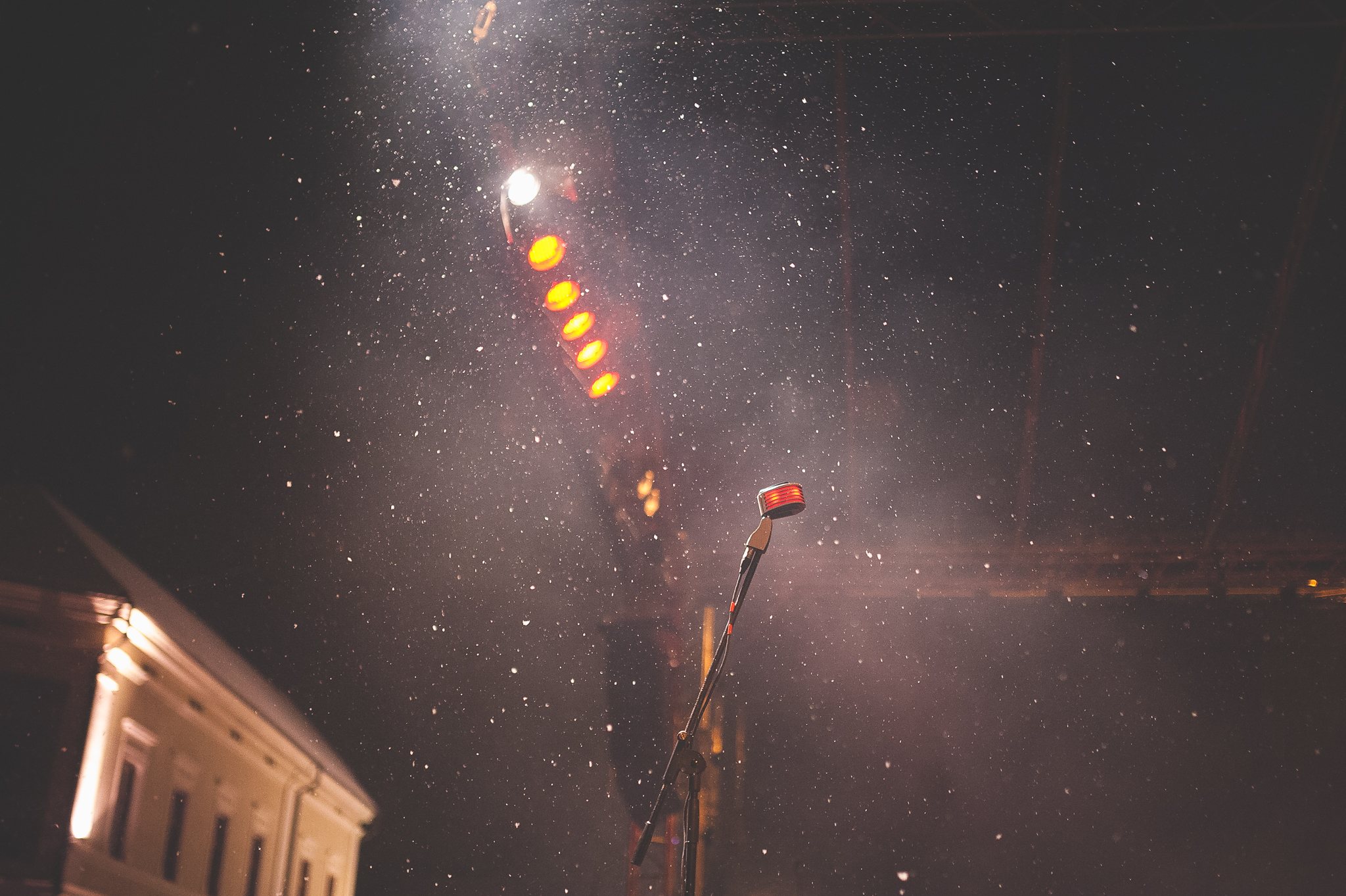 Începuse să ningă chiar înainte să urce Voltaj pe scenă. Când am privit către piață și-am văzut cum ninge m-am simțit ca-n basme. Norocos și fericit. N-am mai prins o așa vreme la niciun alt concert pe care l-am fotografiat în aer liber. Și veți vedea în fotografii cât de mult a contat și ajutat toată ninsoarea asta.