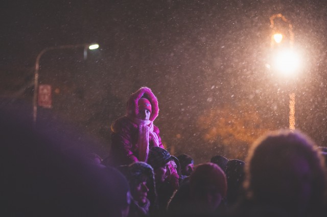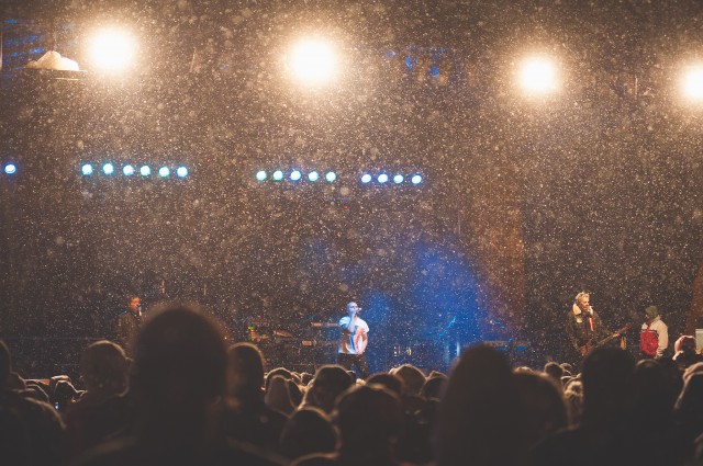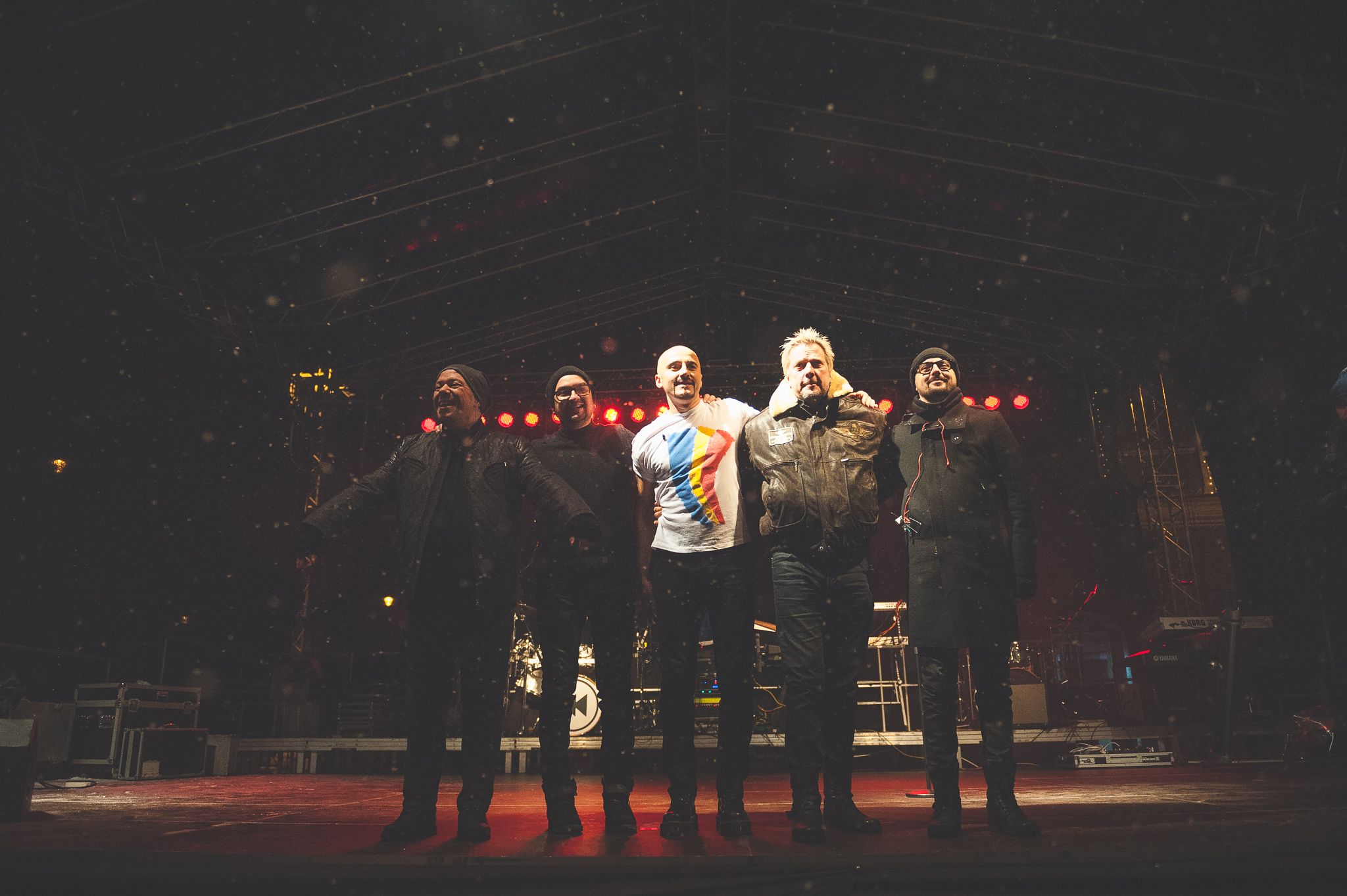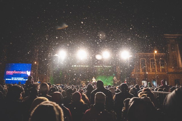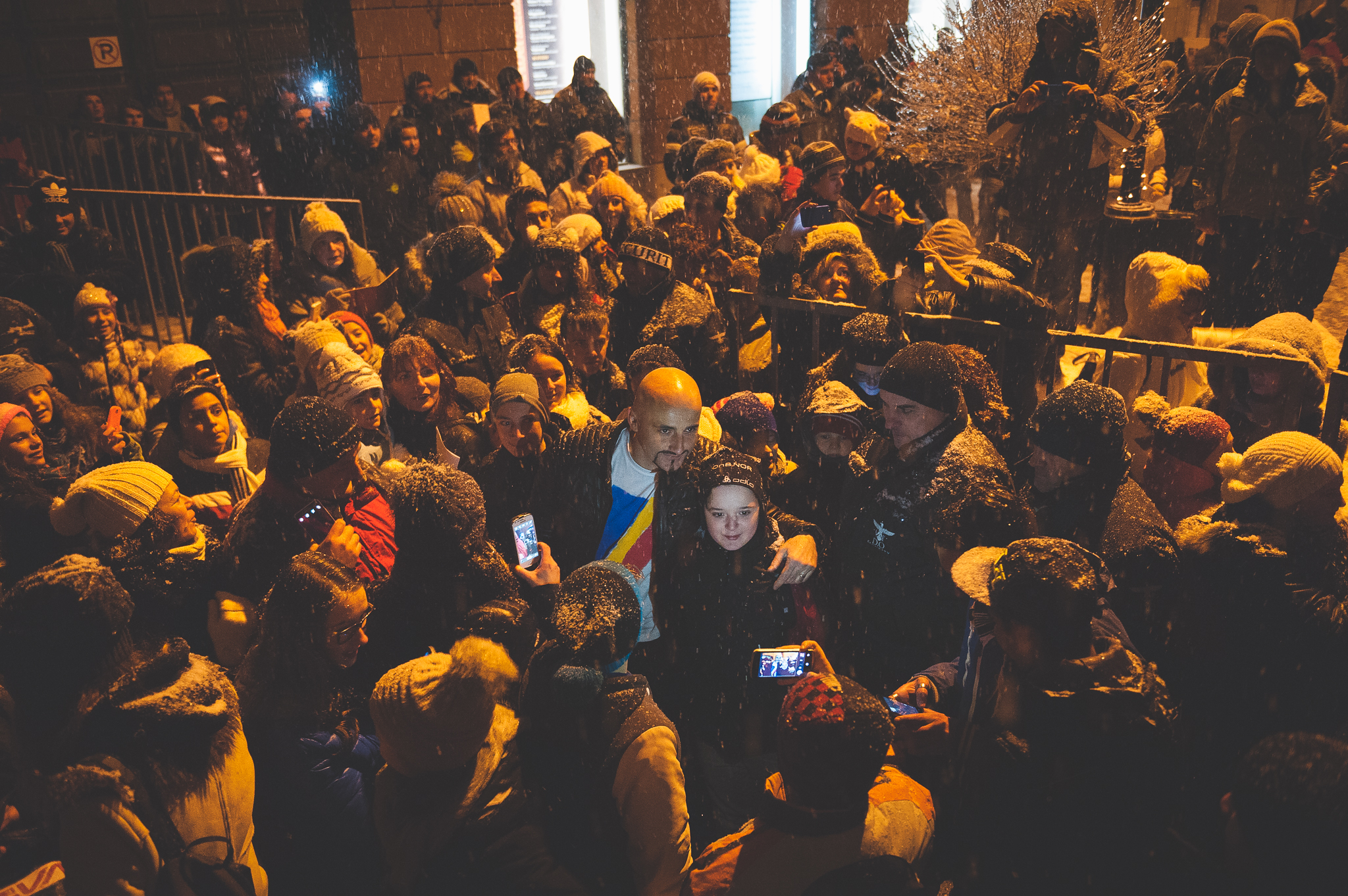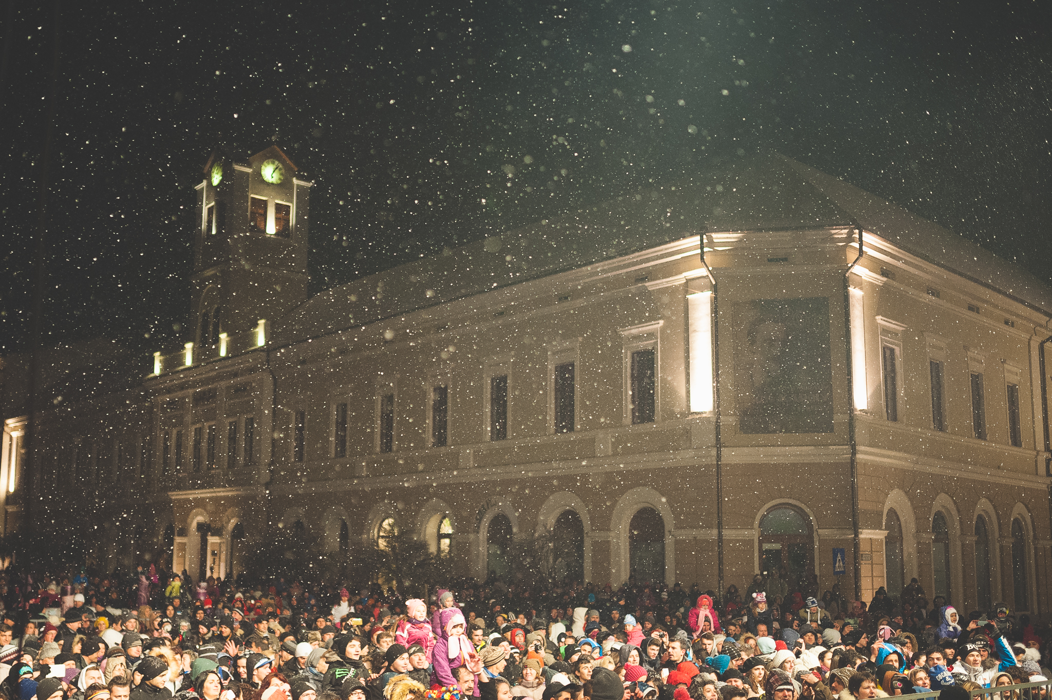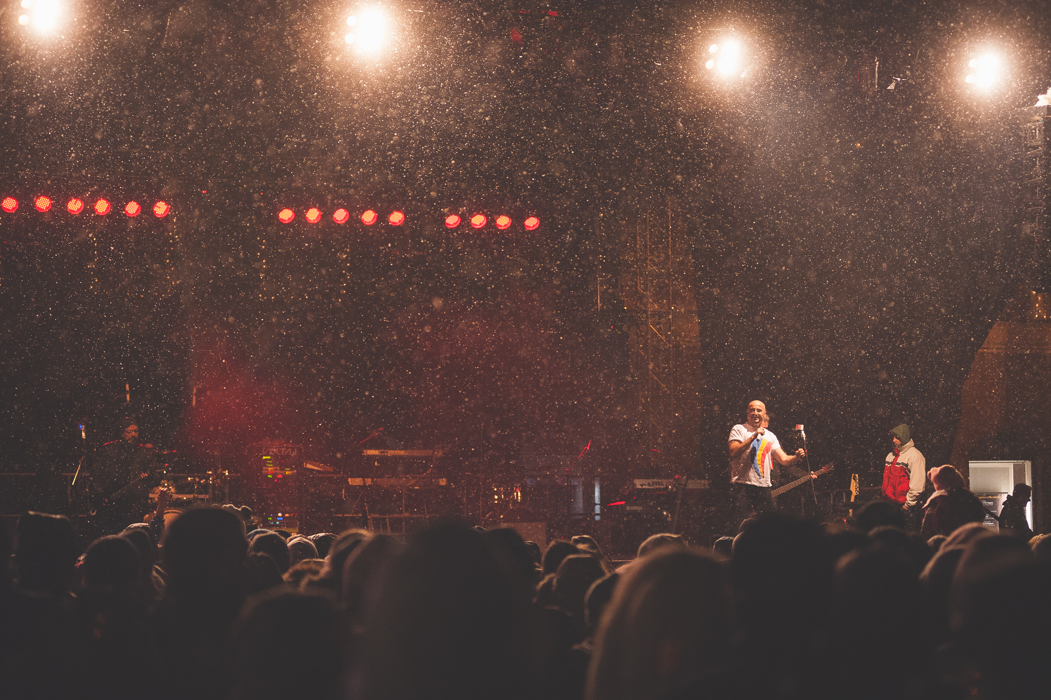 Începuse să ningă chiar înainte să urce Voltaj pe scenă. Când am privit către piață și-am văzut cum ninge m-am simțit ca-n basme. Norocos și fericit. N-am mai prins o așa vreme la niciun alt concert pe care l-am fotografiat în aer liber. Și veți vedea în fotografii cât de mult a contat și ajutat toată ninsoarea asta.
