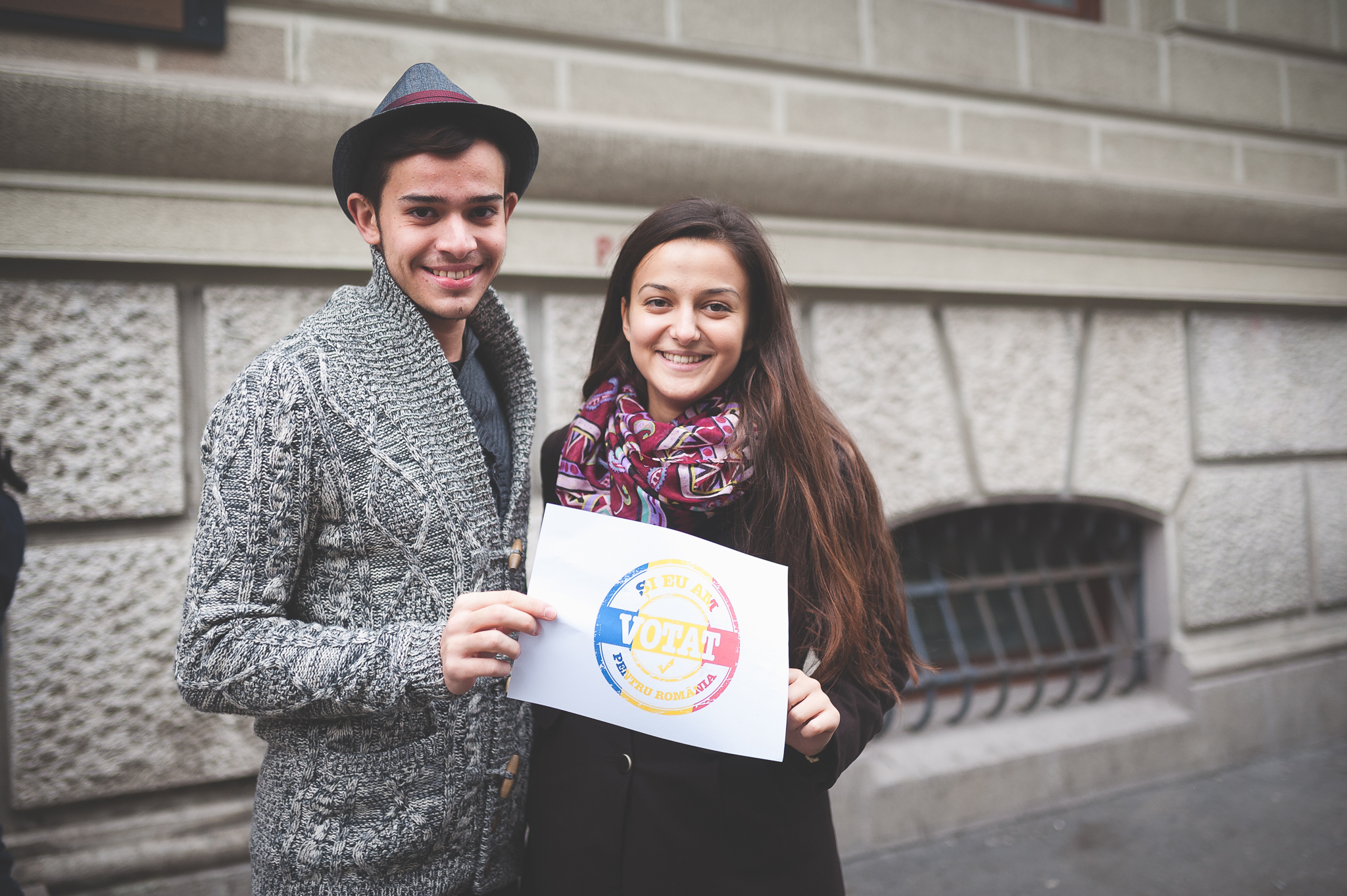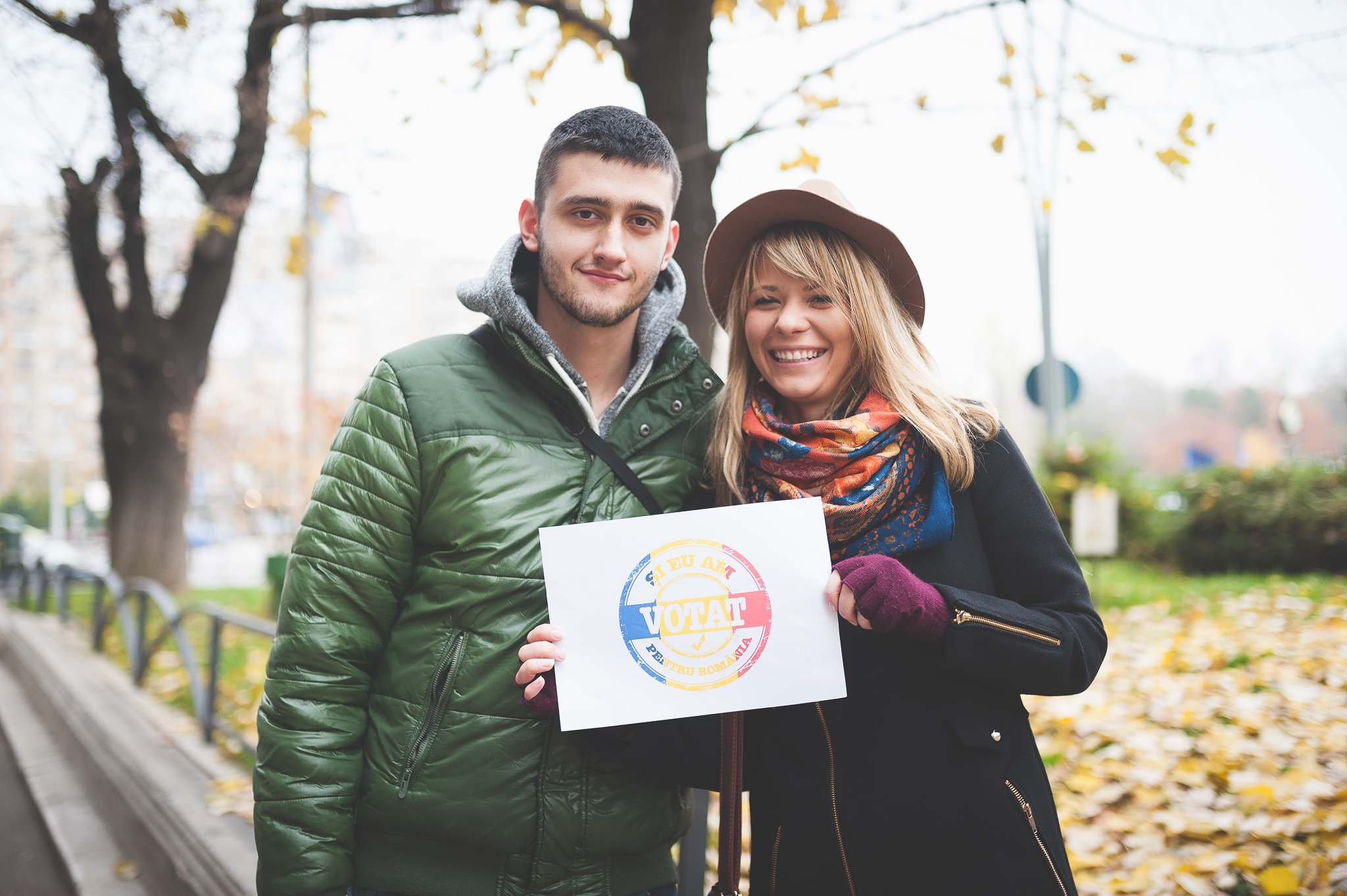 Aici la Șincai am început să fotografiez mai mulți tineri și atunci mi-am dat seama că asta ar fi direcția pe care ar trebui să merg. Dat fiind că procentul de mers la vot între 18-24 de ani era cel mai mic dintre toate categoriile de vârstă am zis să mizez pe treaba asta. Iar mesajul meu de aici în colo s-a adresat în mare parte tinerilor, invitația în proiect sunând așa: „Bună! Îmi cer scuze că te deranjez. Am început un proiect pe Facebook ca să îndemn tinerii de vârsta noastră să voteze. Așa că îi fotografiez pe cei care au votat deja, ca tine, cu hârtia asta în mână. Îți pot face o fotografie în semn de susținere?”