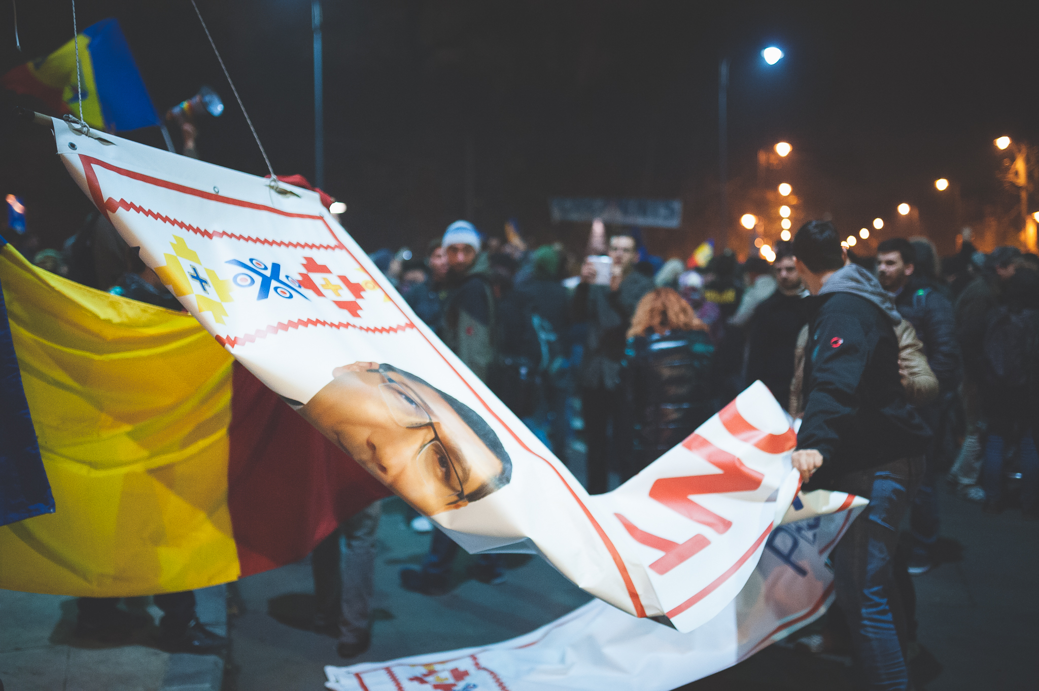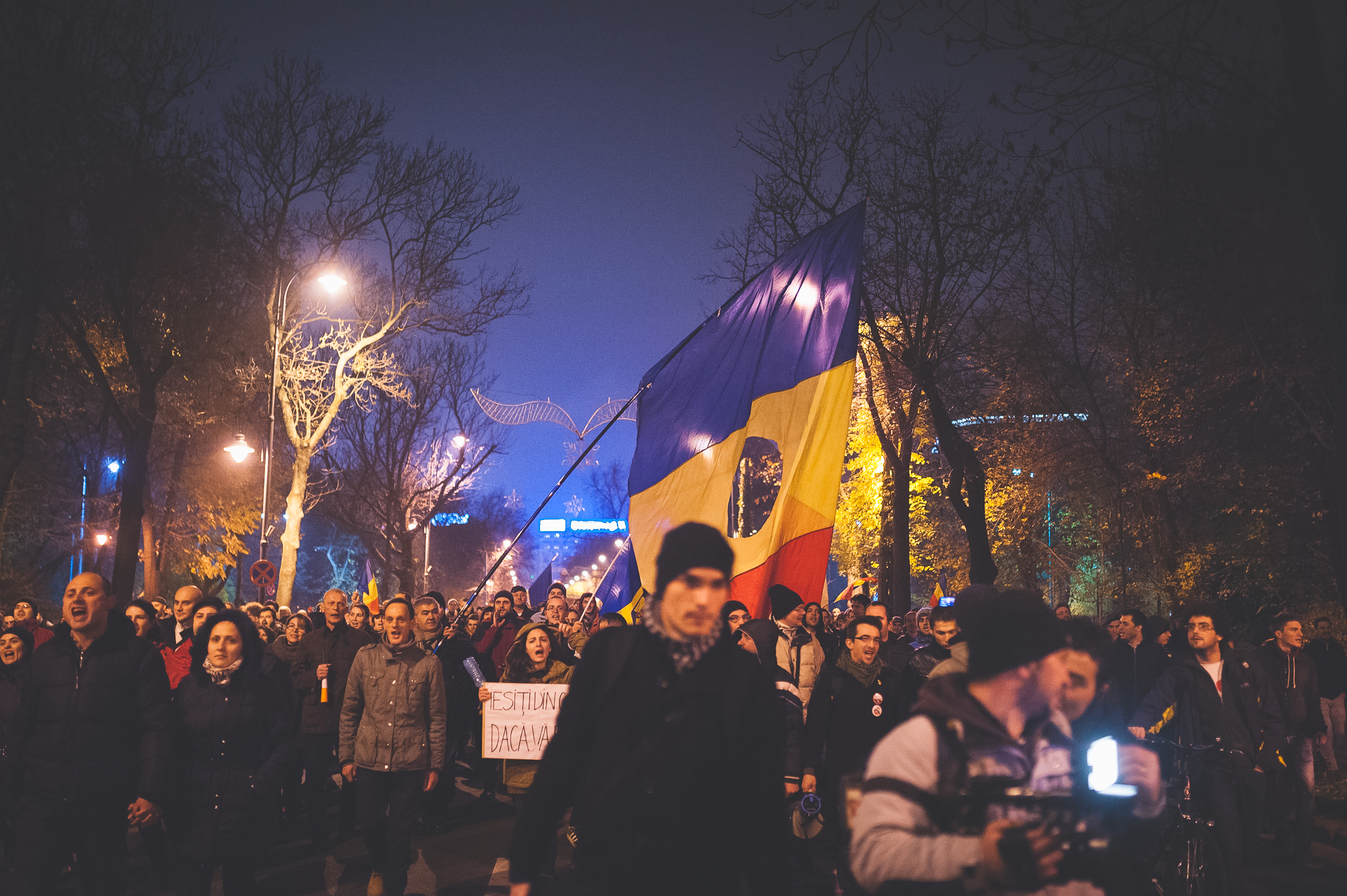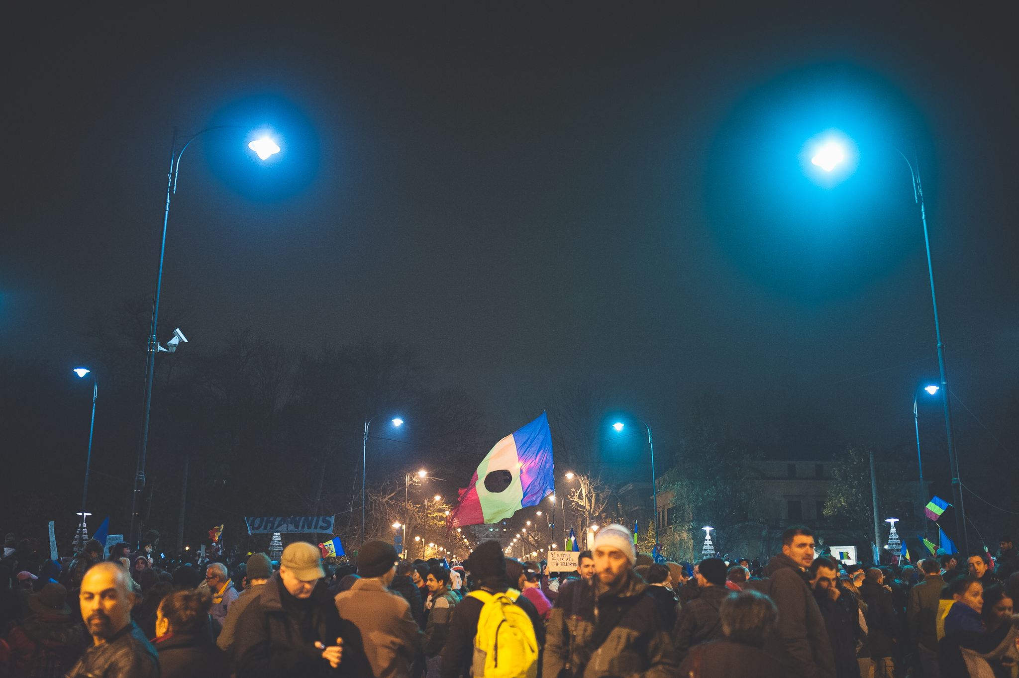 N-am fotografiat multe proteste, așa că m-a surprins de la început numărul mare de oameni. Nu știu să estimez corect, dar sigur erau 2.000. Voiau să meargă spre sediul PSD, doar că jandarmii au blocat accesul de la jumătatea bulevardului. La un moment dat câțiva tineri au reușit să spargă zidul de jandarmi de pe-o stradă lătularnică, dar probabil c-au fost opriți rapid câțiva metri mai încolo. Nu i-am mai văzut apoi.