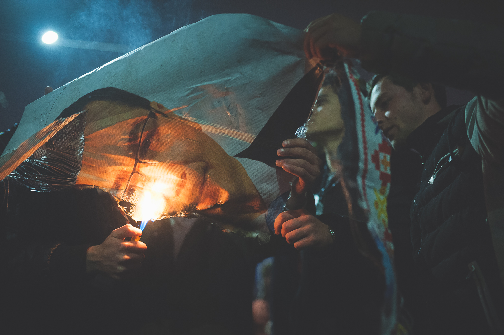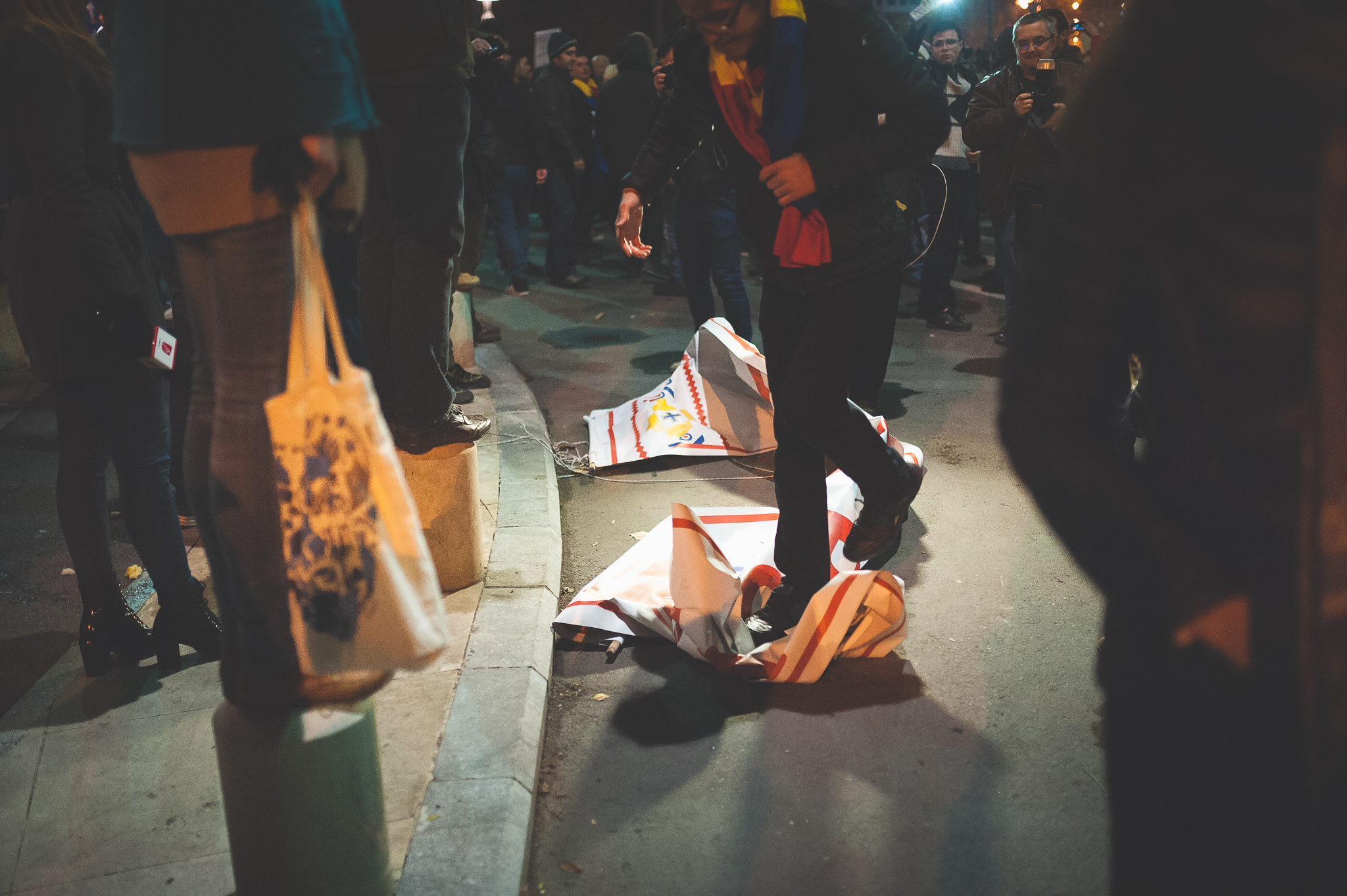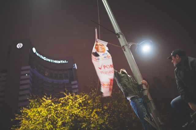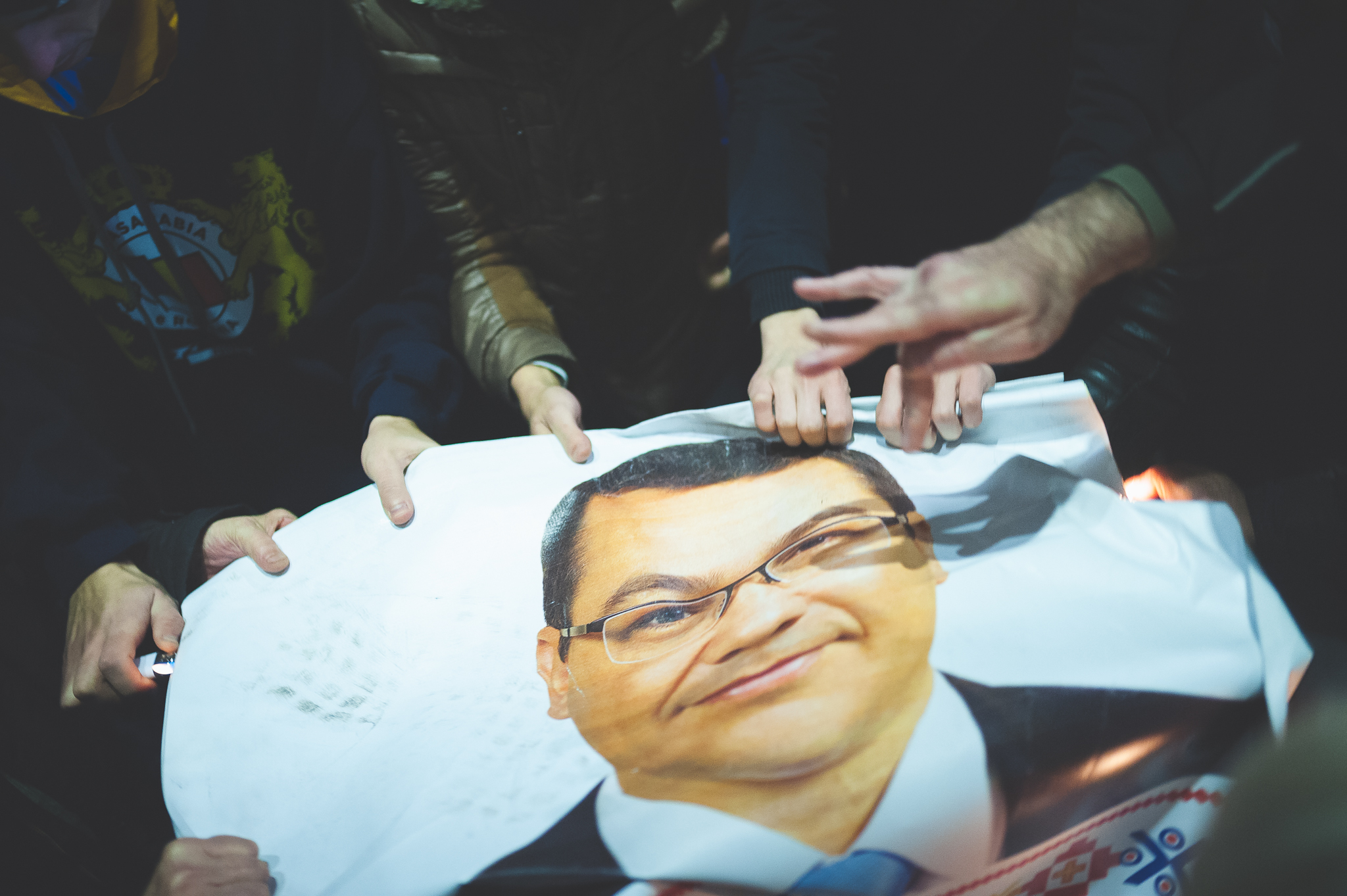 Încep să se rupă afișele cu Ponta. Câțiva oameni încearcă să le dea foc.