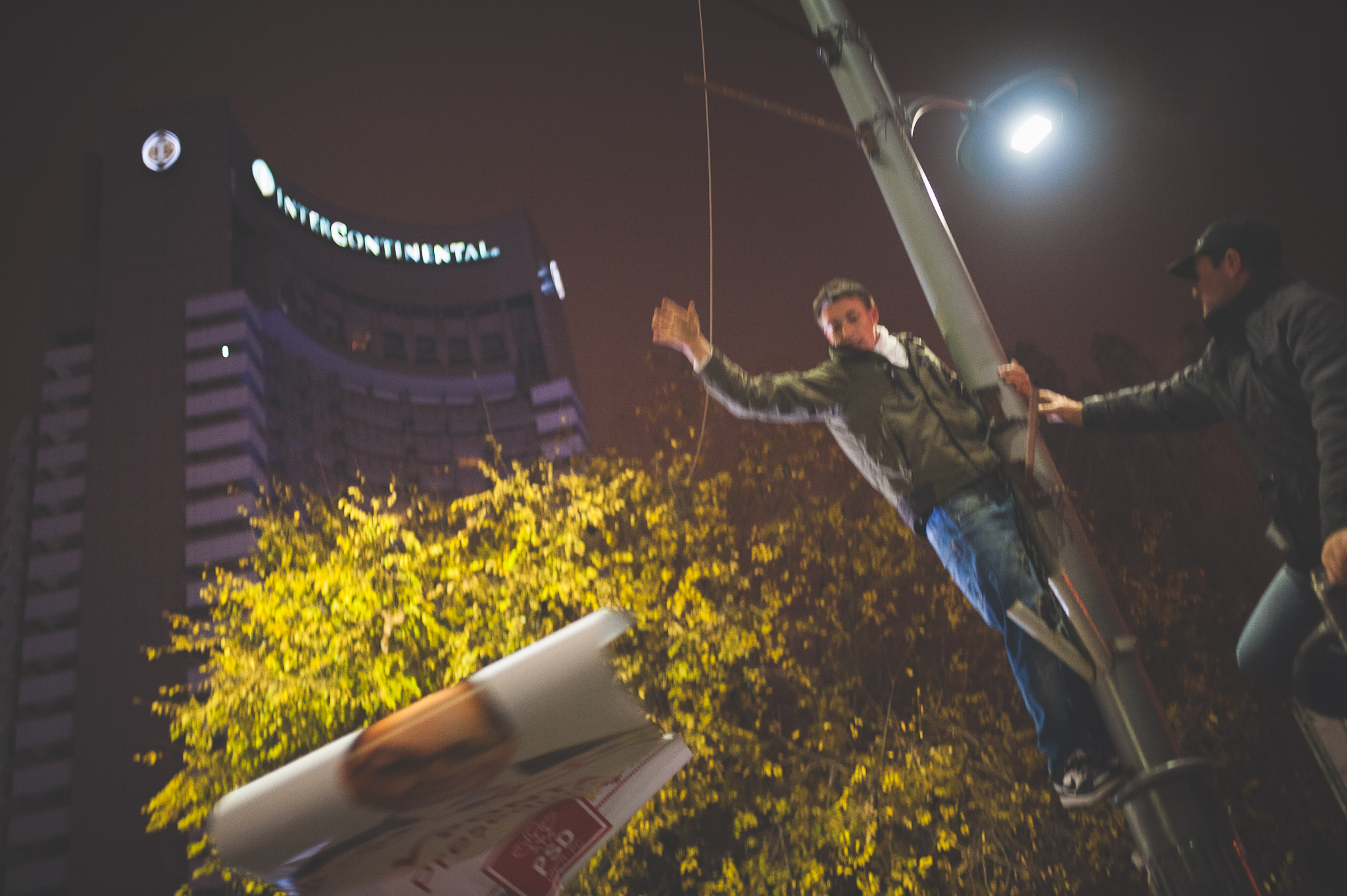 Mulțimea își varsă nervii pe afișele astea. Între timp circulă vorba că Iohannis ar fi ieșit președinte și că Ponta l-a fi felicitat. E-un gest de fair-play care-și avea locul din punctul de vedere al unui tânăr care-a aflat despre politică zilele astea fotografiind strada.
