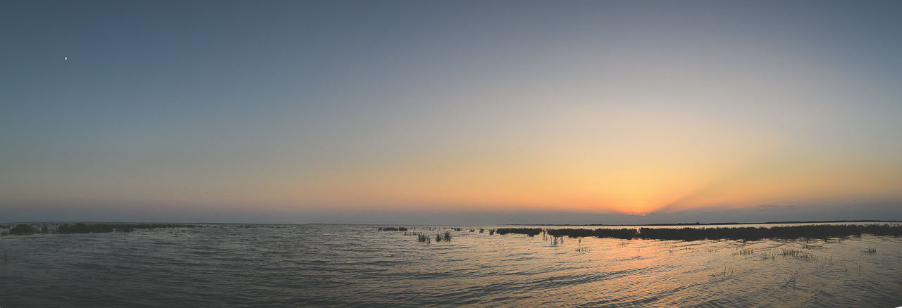 Cu astfel de momente a fost fiecare zi. Experiența Anonimul? Minunată! Delta? Cel mai frumos loc pe care l-am văzut până acum! M-am bucurat tare mult când l-am cunoscut pe Nea Sandu, localnic din Sfântu Gheorghe, care ne-a plimbat cu barca pe canalele înguste ale deltei, unde n-aș fi zis că intrăm nici cu hidrobicicleta. Ne-a adus în locuri în care am văzut câteva păsări minunate și peisaje de vis. Am prins împreună un răsărit și un apus și am făcut câteva fotografii de care-s tare încântat. Una dintre ele e aceasta, de la răsărit. Pâlcul de nisip pe care stăteau pelicanii se afla exact în locul în care Dunărea se varsă în mare. În prim-plan vezi Dunărea, în fundal Marea Neagră. Dar despre plimbările pe Dunăre și fotografiile făcute pe parcursul lor am să povestesc în următorul fotoreportaj.