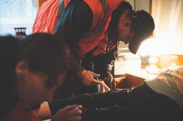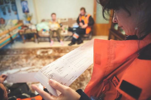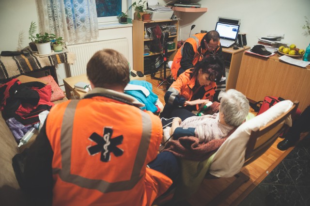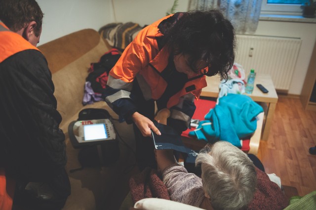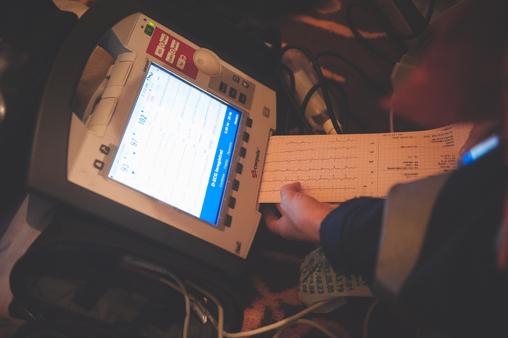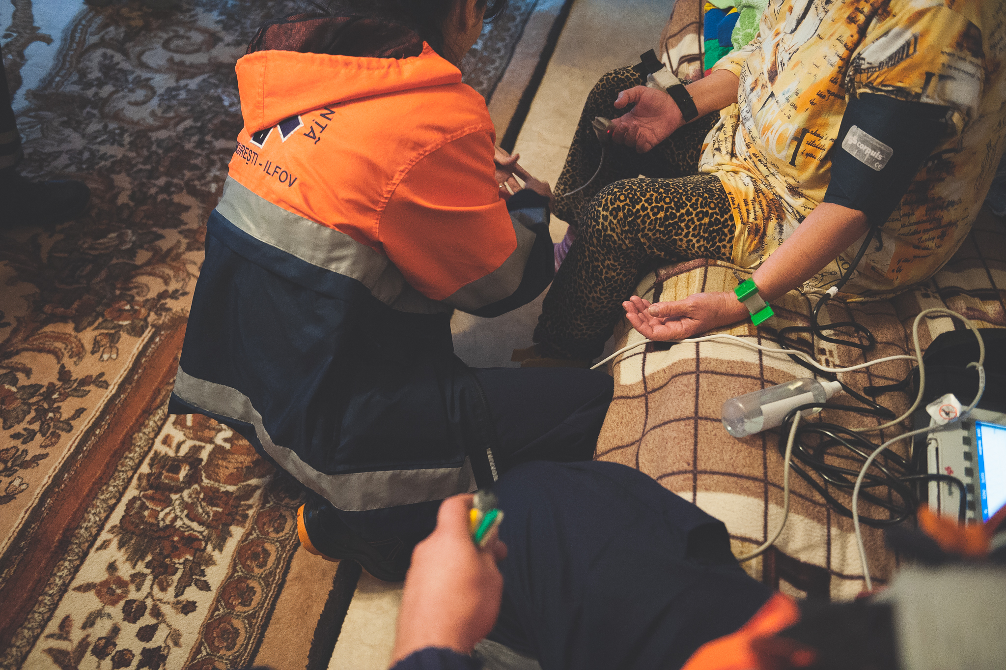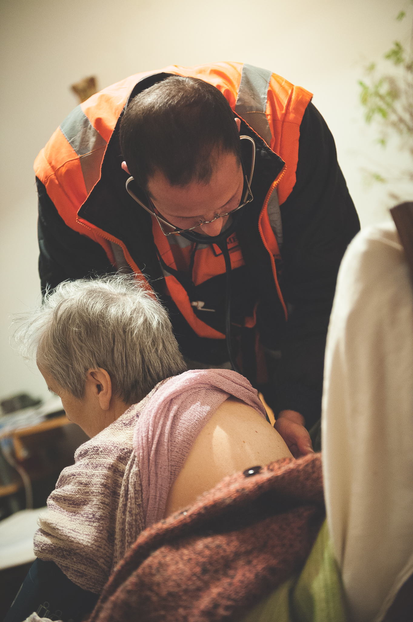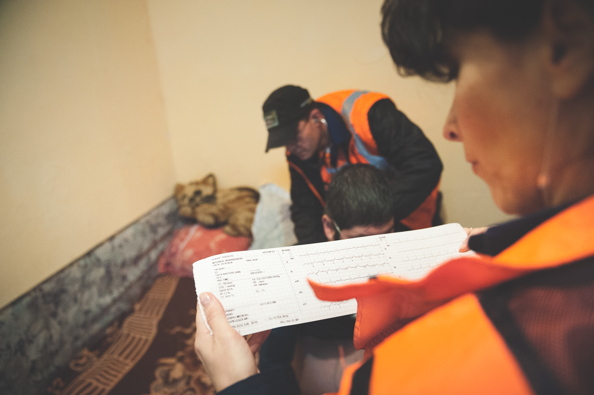 Pe măsură ce dr. Carniciu și asist. Jianu îi făceau un EKG tatălui ei și îl consultau, junioara încerca să ne ajute așa cum putea mai bine. Mă vedea stând în picioare și fotografiind și m-a întrebat dacă vreau un scaun. Nu aveam nevoie, dar i-am răspuns afirmativ și am văzut un zâmbet de mulțumire pe chipul ei. Simțea că este de ajutor.