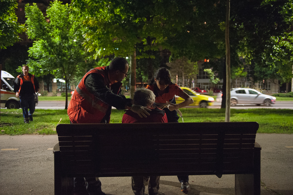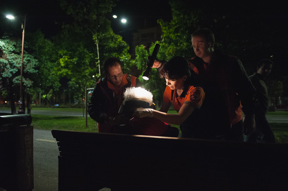 Ajunși pe Bulevardul Unirii l-am localizat pe domnul rănit raportat de echipajul de poliție. Se lovise la cap. Cel mai probabil căzuse. Acum stătea pe o bancă. Era în stare de ebrietate și puțin recalcitrant.