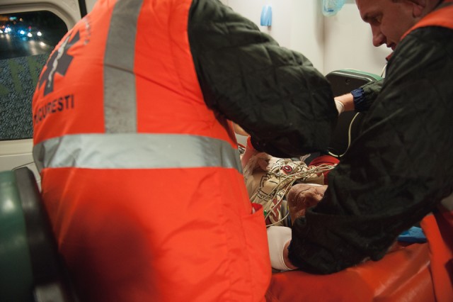 A fost nevoie să-l ținem tot drumul de mâini pentru că voia în permanență să se ridice și plece. După alte câteva minute am ajuns la Spitalul Universitar, iar de aici a fost preluat mai departe.