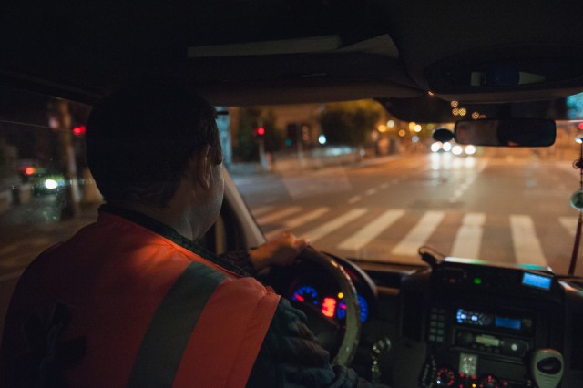 Ne îndreptăm spre microstația 5 de unde am plecat când am intrat de gardă. Asta se face când numărul de cazuri scade și nu ți s-a repartizat niciunul. Te întorci la „microstația mamă”, ca să o numesc așa.