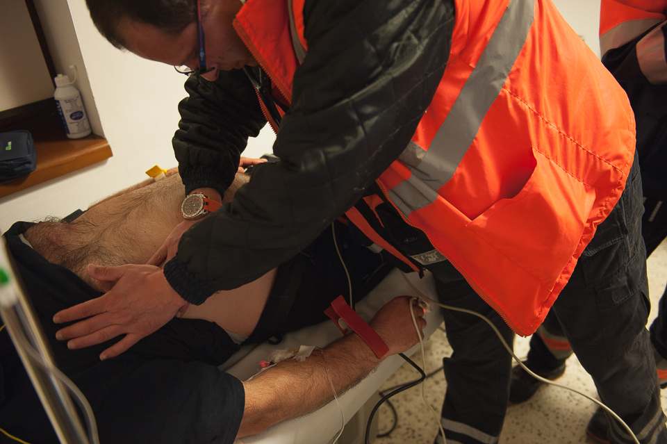 În tot timpul acesta am luat echipamentul din ambulanță și am pornit să intrăm în curte. De aici dr. Carniciu și asist. Jianu i-au făcut pacientului verificările de rigoare, au identificat starea în care se află, i-au administrat anumite substanțe care să-i stabilizeze situația, iar apoi au luat decizia de a-l duce la spitalul Sf. Ioan.