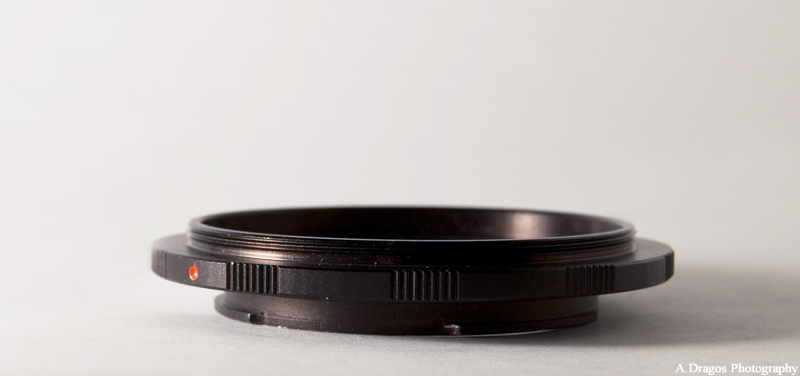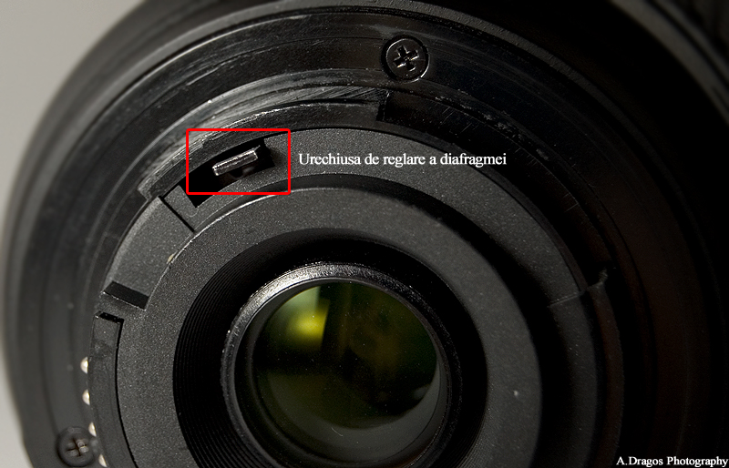 În cazul în care nu doriţi să achiziţionaţi acest inel există soluţia gratuită, aceea de a ţine obiectivul lipit de aparat dar în mână, scăzându-vă astfel puţin mobilitatea. Odată ce aţi montat obiectivul pe aparat urmează reglarea distanţei focale şi a diafragmei. Pentru a putea regla diafragma este necesar să trageţi manual de acea mică urechiuşă (prezentată în imaginea de mai jos), setând astfel cantitatea de lumină care va pătrunde în aparat dar şi câmpul de profunzime.