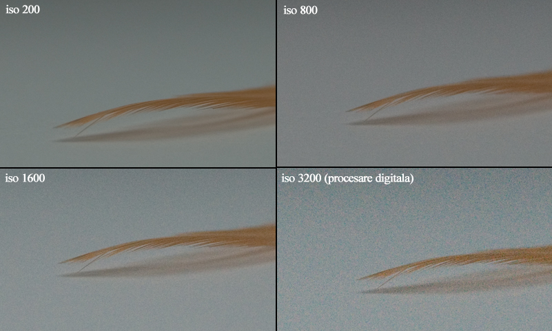 În cazul în care aţi ales folosirea unei valori medii (800 de exemplu) şi rezultatul este unul plăcut încercaţi să nu post-procesaţi foarte mult fotografia deoarece zgomotul va apărea încet, încet şi se va intensifica foarte tare în momentul în care depăşiţi limita. În imaginea următoare puteţi vedea impactul care îl are valoarea ridicată a ISO-ului asupra unei fotografii împreună cu zgomotul generat de acesta. Imaginile prezintă un crop 100% centrat din fotografia iniţială.