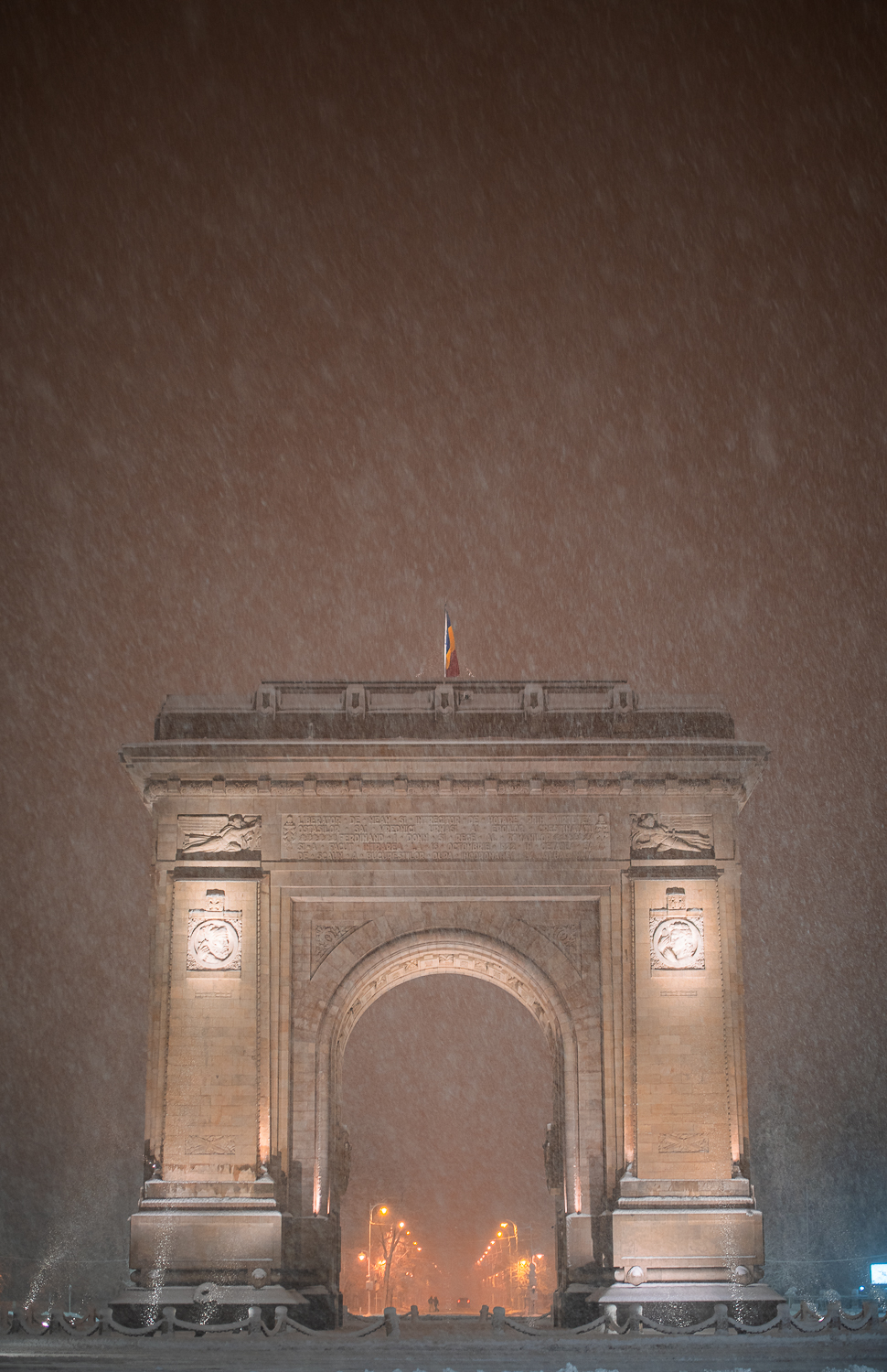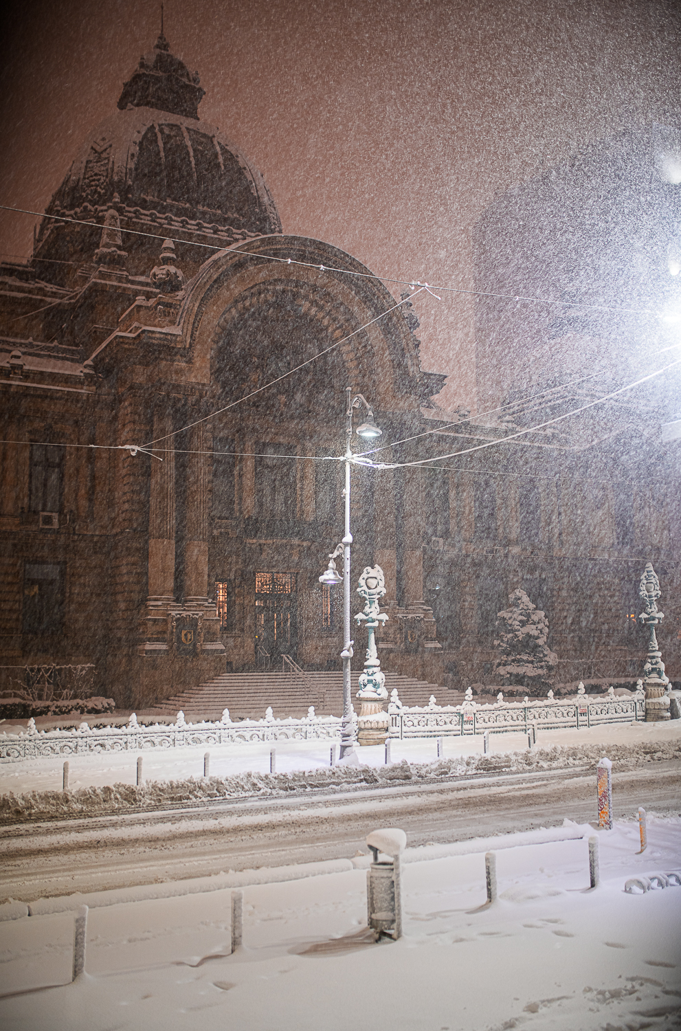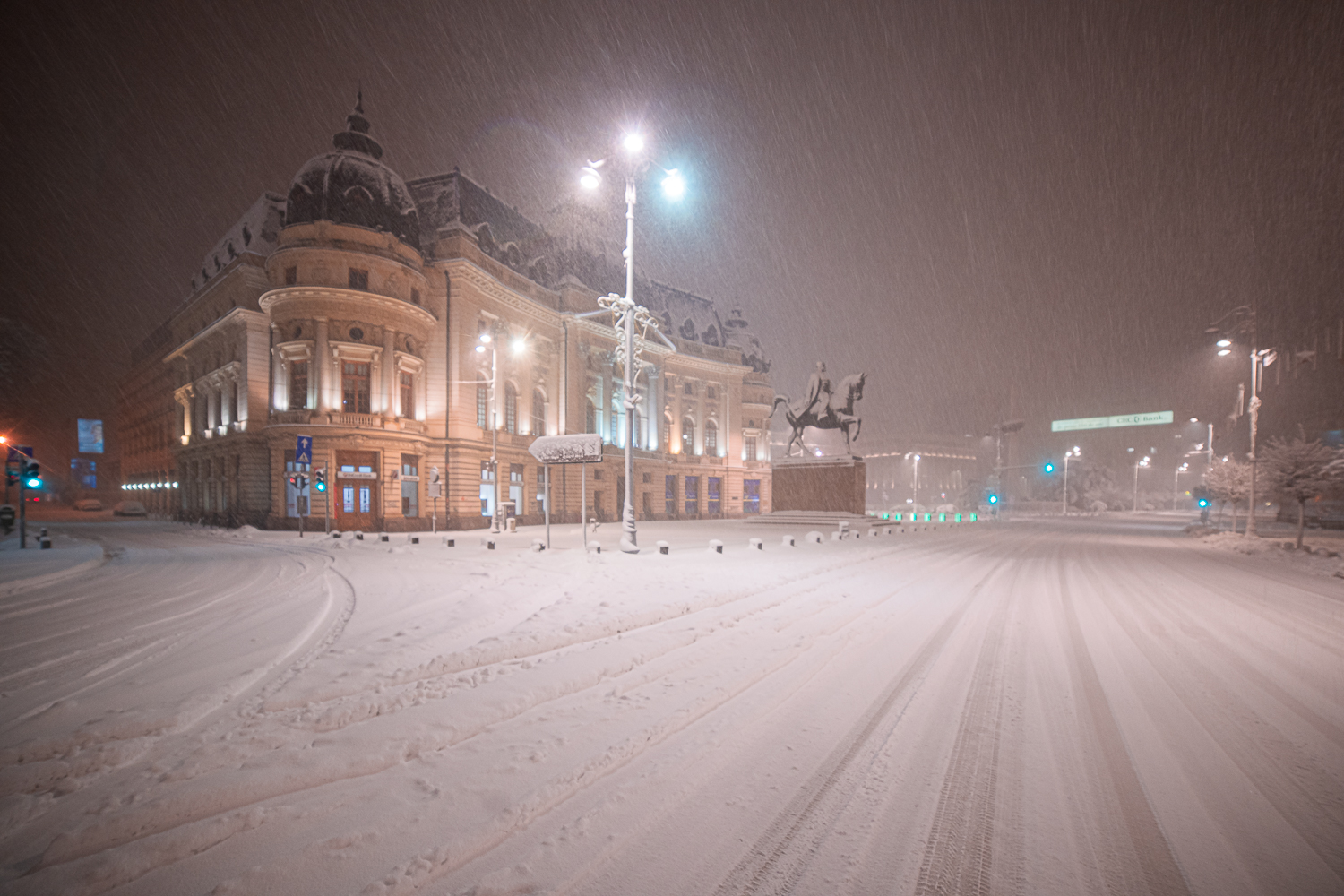 Toiul nopții m-a prins traversând Bucureștiul de la Arcul de Triumf spre centru, apoi înapoi în nord, când pe străduțe, când pe bulevardele mari, dar tot goale. Doar plugurile mai opreau puțin din liniștea dată de fulgii mari de zăpadă.