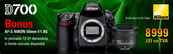 O altă promoție interesantă vine la unul dintre cel mai bun D-SLR din gama Nikon, D700. Achiziționându-l veți primi gratuit obiectivul Nikkor AF-S 50mm f/1.8G. Astfel, la 8999 lei aveți kit-ul format din Nikon D700 și Nikkor AF-S 50mm f/1.8 G.