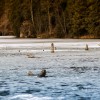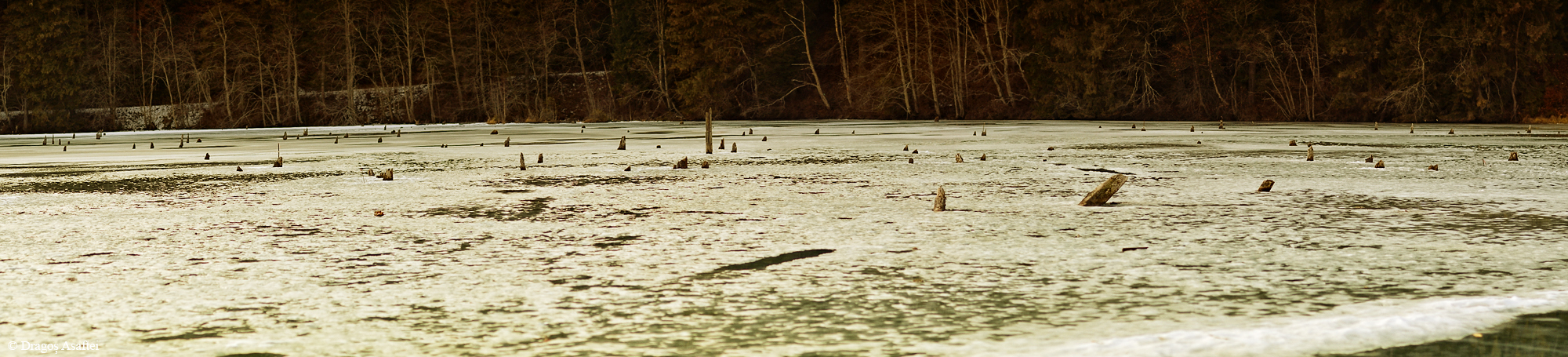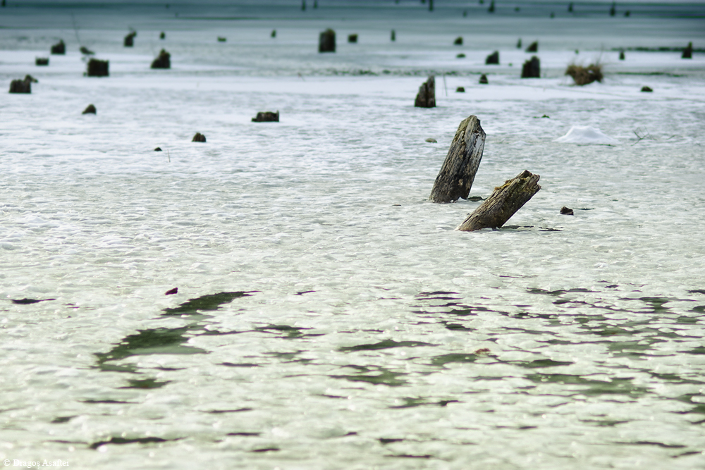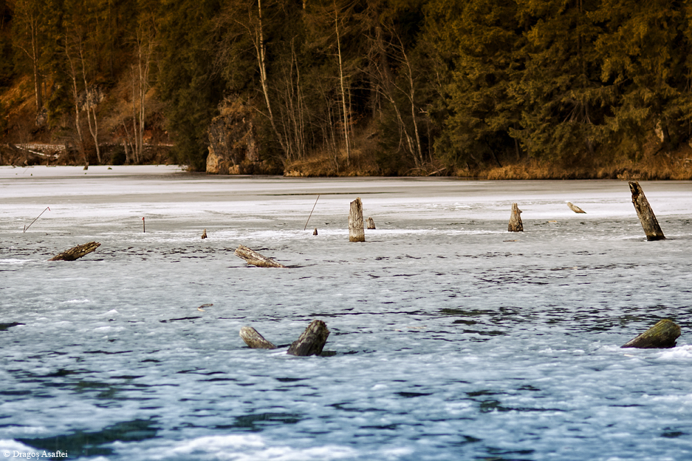 În urmă cu câteva zile, trecând pe lângă Lacul Roșu, am avut ocazia de a-l fotografia înghețat, sau cel puțin la limita de îngheț. Acum se văd probabil cel mai bine trunchiurile copacilor care ies din lac și munții care îi oferă un aer aparte și totodată de supremație.