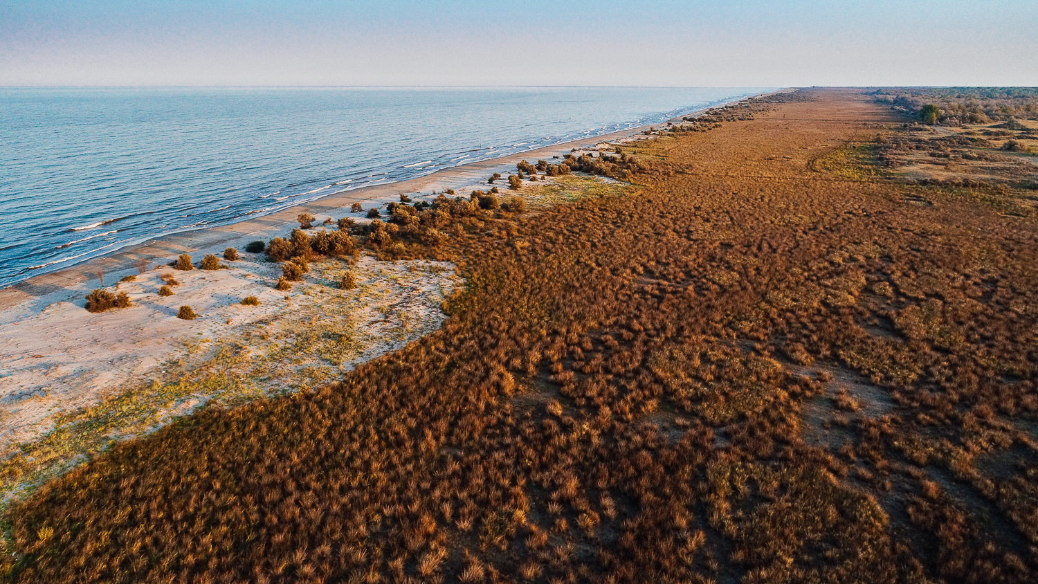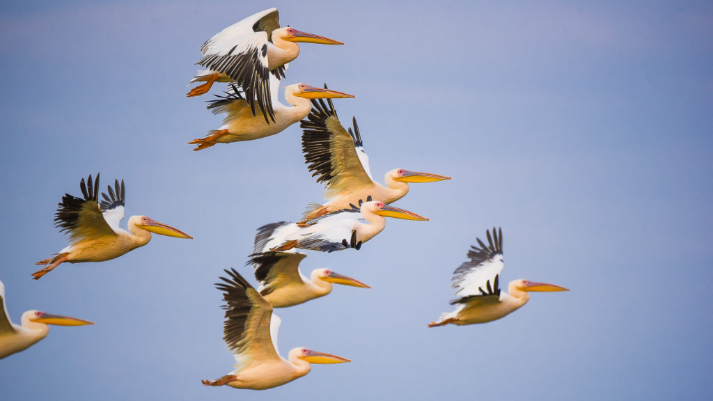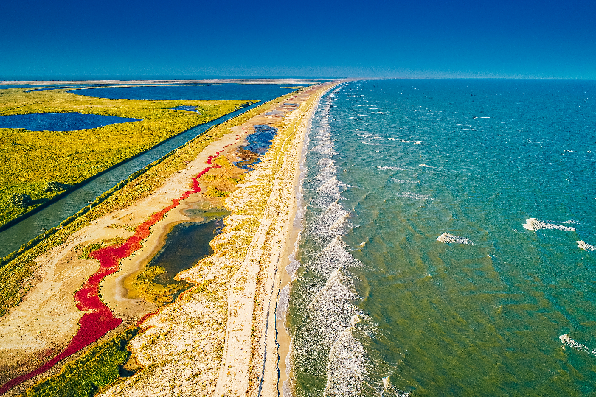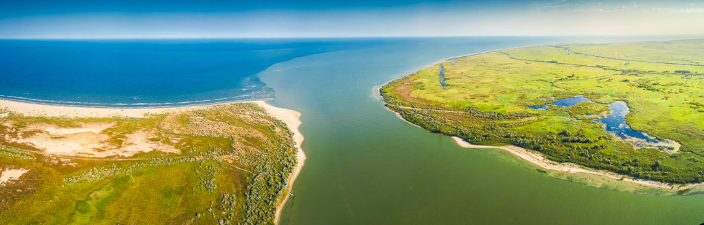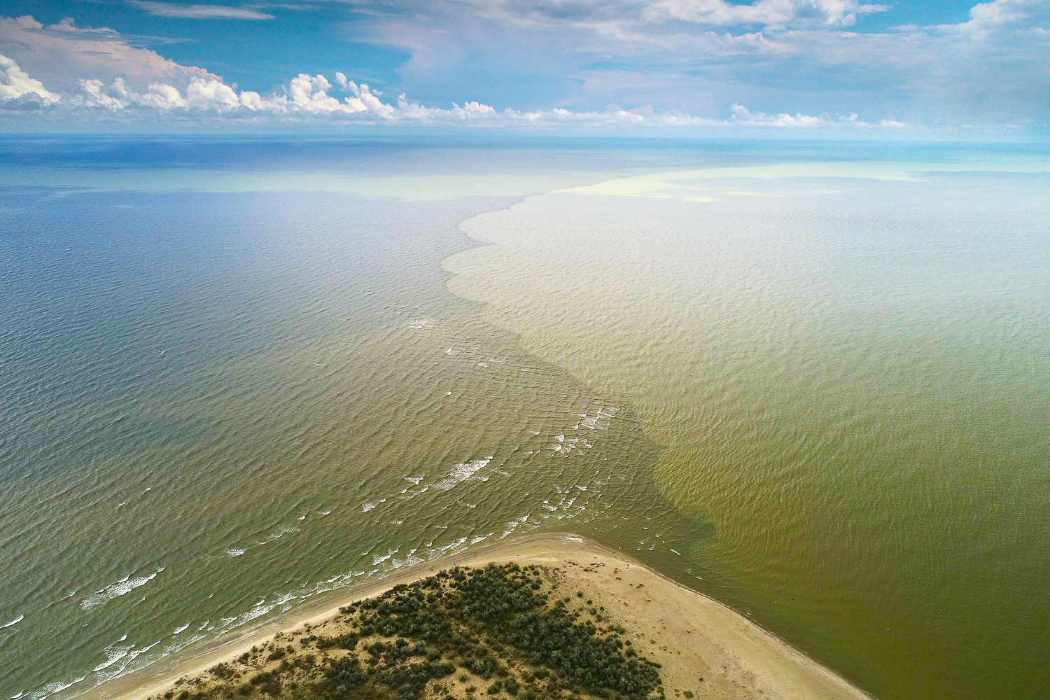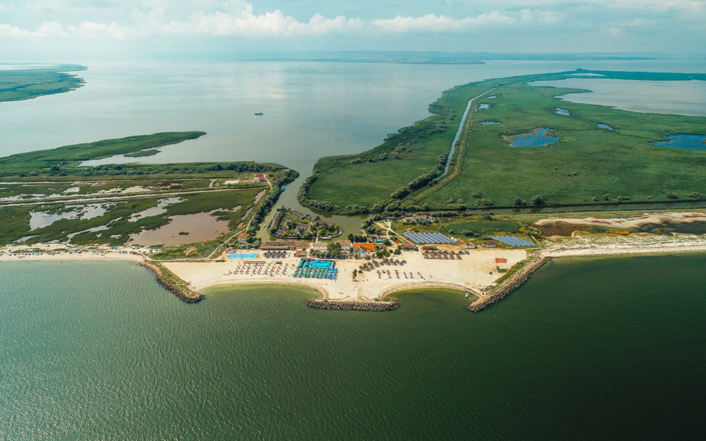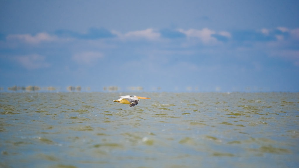 Pelicanii stau pe un banc de nisip aflat între Dunăre (prim plan) și Marea Neagră (fundal)