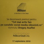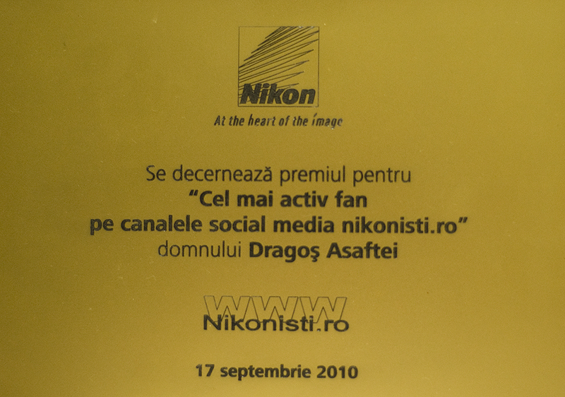 Imediat după începere au fost oferite şase premii celor mai activi fani Nikon din România. M-am numărat şi eu printre aceştia şi am primit premiul pentru cel mai activ fan pe canalele social media nikonisti.ro . Mulţumesc Nikon România! (se poate vedea aici filmuleţul din timpul înmânării premiului – realizat de Avola.ro)