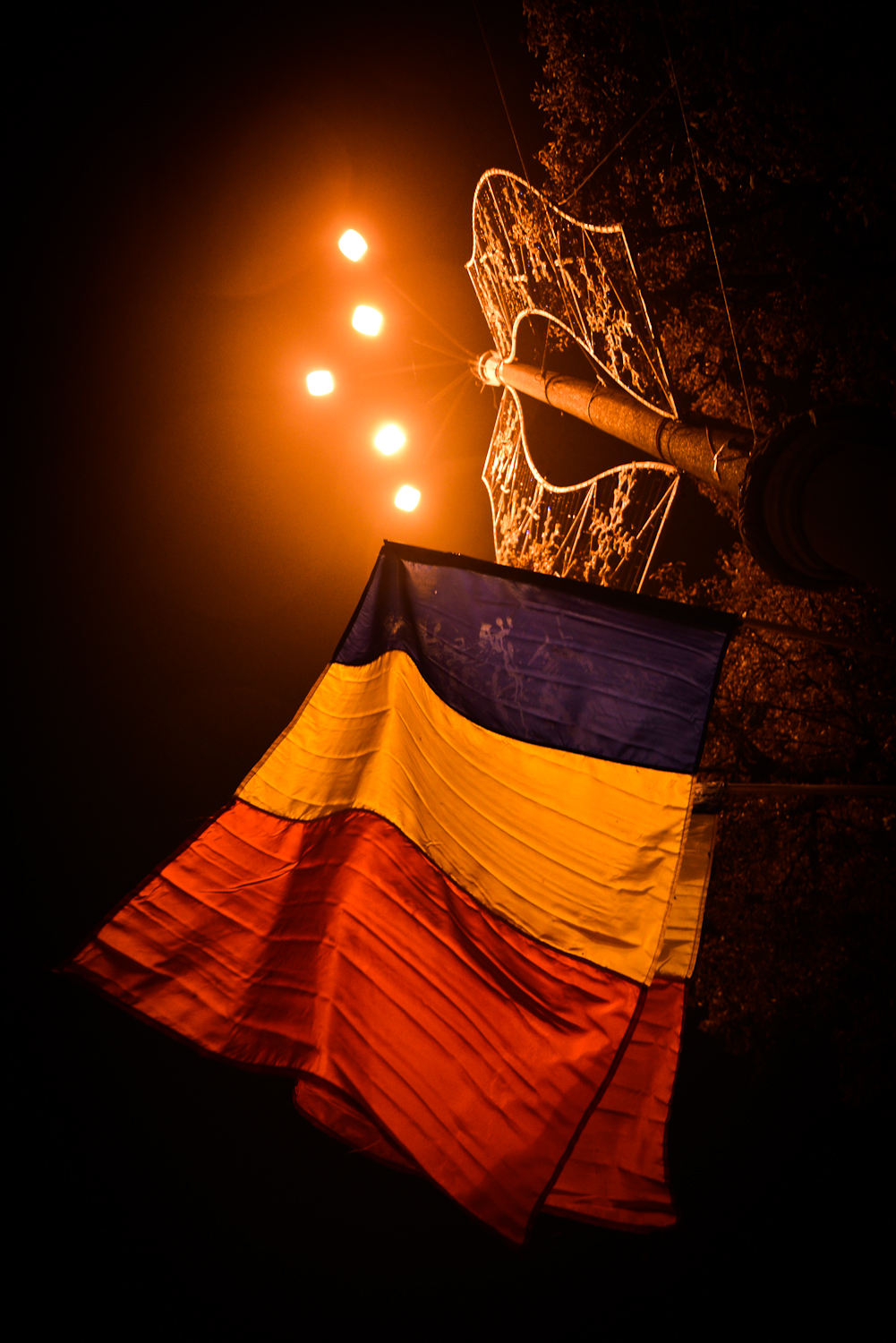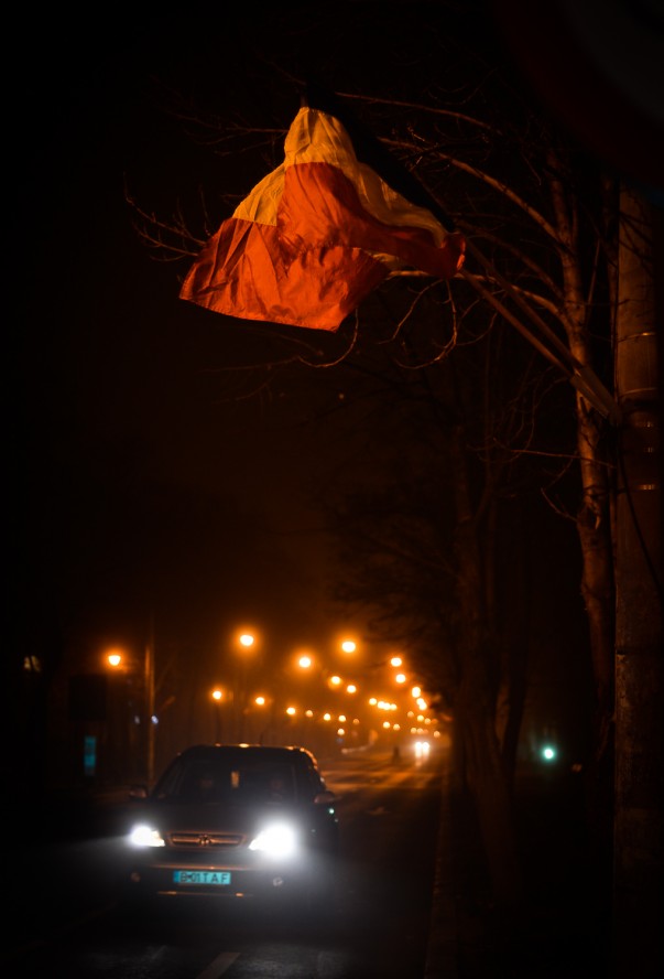 Era o ceață venită parcă să învăluie tot ce a adus Ziua Națională. Steagurile apăreau și dispăreau din ceață ca într-un film… de groază. Era așa, o senzație tare ciudată. Nu era ceața aceea lină, calmă, care pare să îți dea o stare de plutire. Era o ceață aparte, densă, puternică și rece. Cam așa arătau câteva locuri din București pe ceața din acea seară.