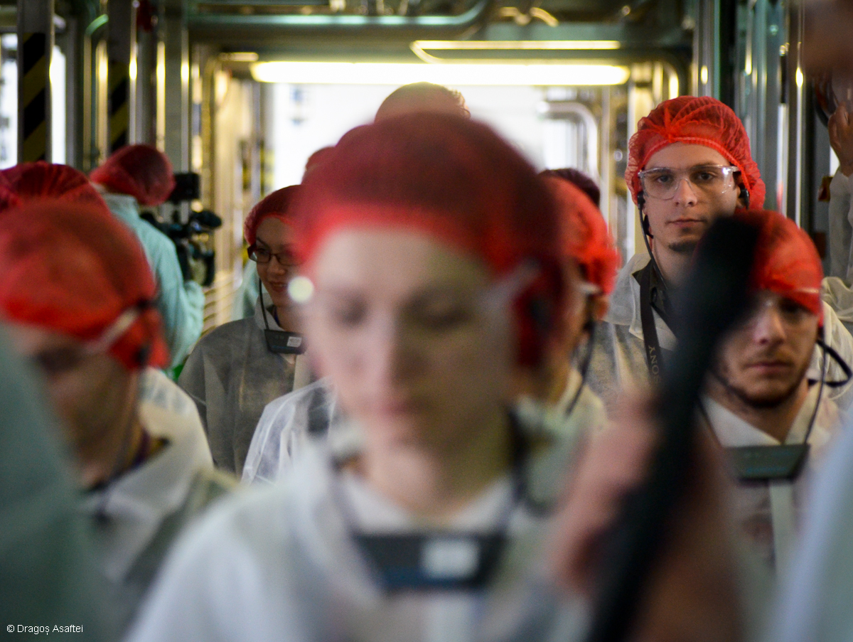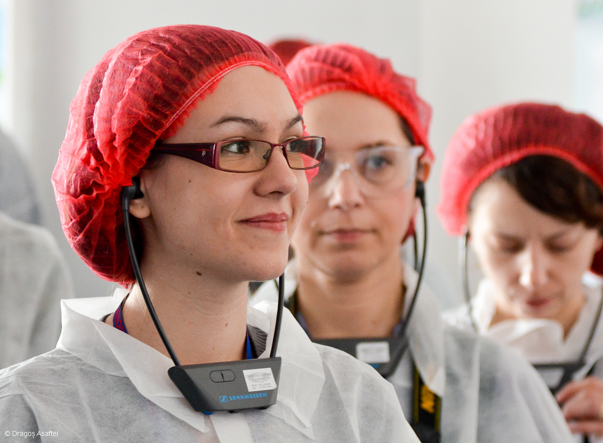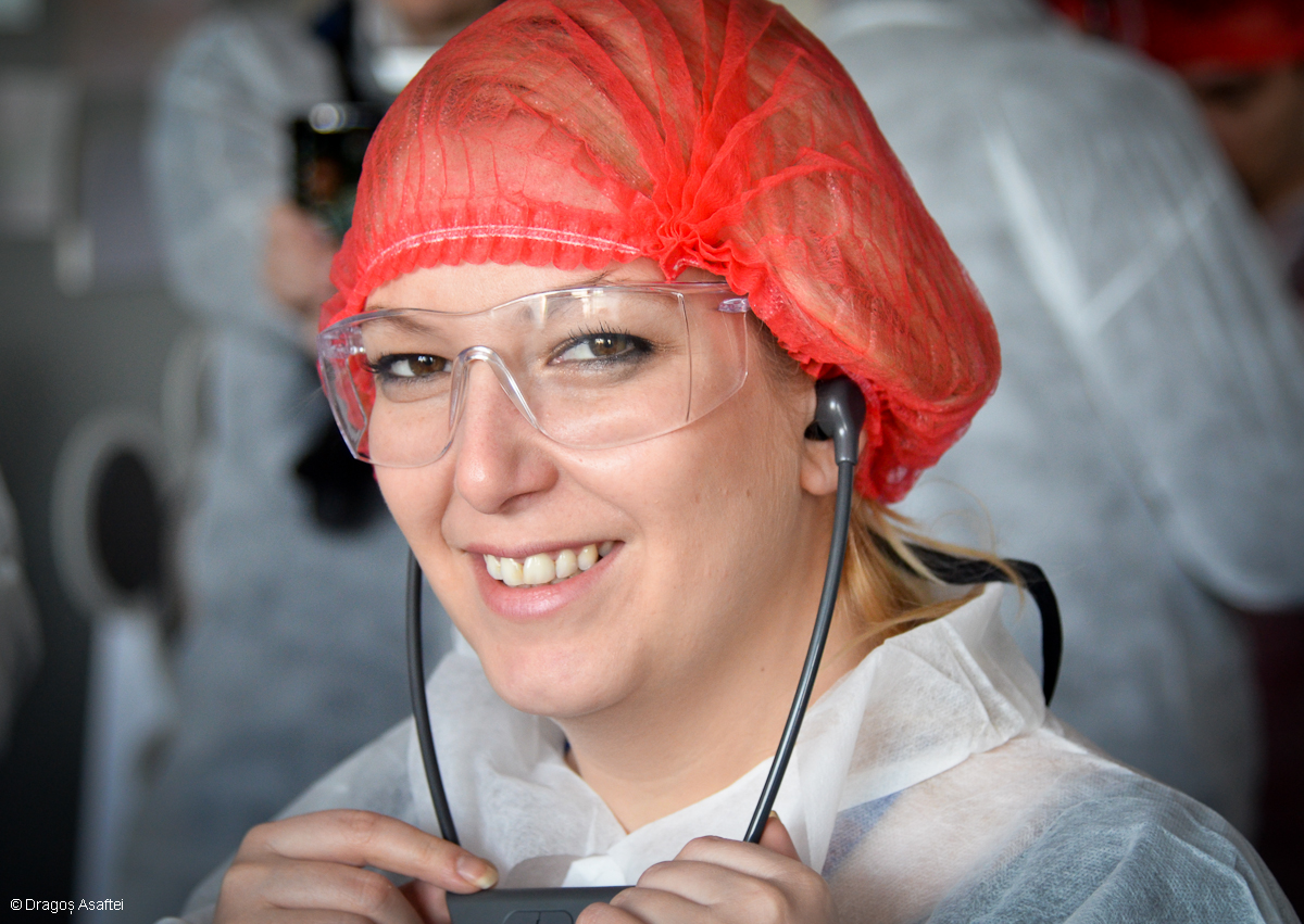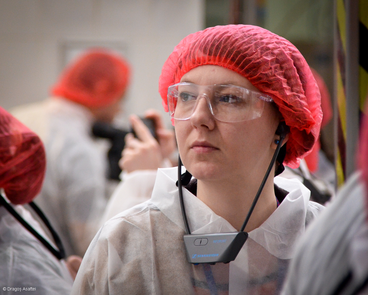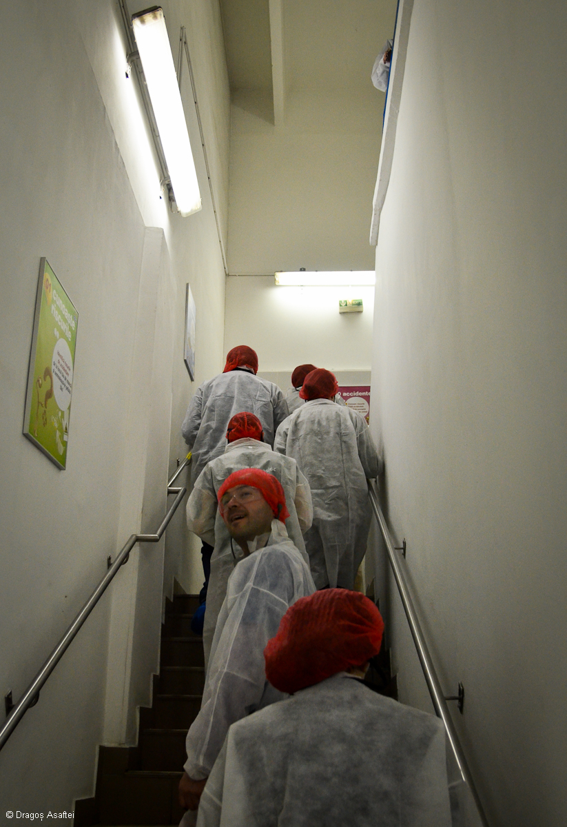 Trecând la vizitarea fabricii, am fost nevoiți să purtăm un echipament special pentru a nu contamina zona de producție. Chiar dacă produsele nu se află în contact direct cu niciun alt mediu, mijloacele de protecție au fost necesare. Arătam toți ca niște cosmauți simpatici.