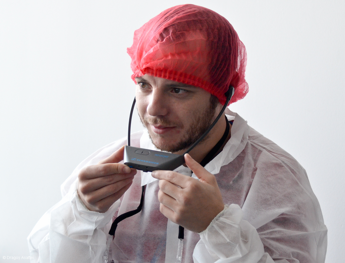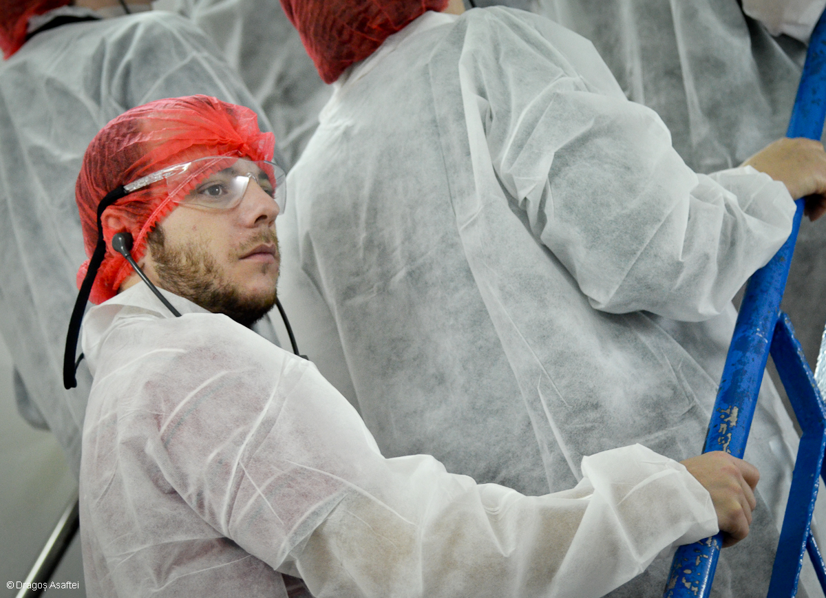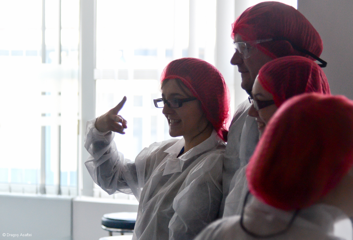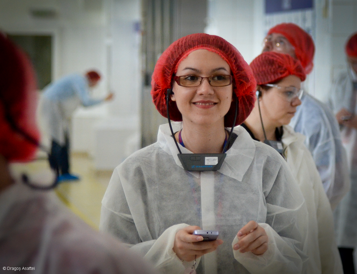 Trecând la vizitarea fabricii, am fost nevoiți să purtăm un echipament special pentru a nu contamina zona de producție. Chiar dacă produsele nu se află în contact direct cu niciun alt mediu, mijloacele de protecție au fost necesare. Arătam toți ca niște cosmauți simpatici.