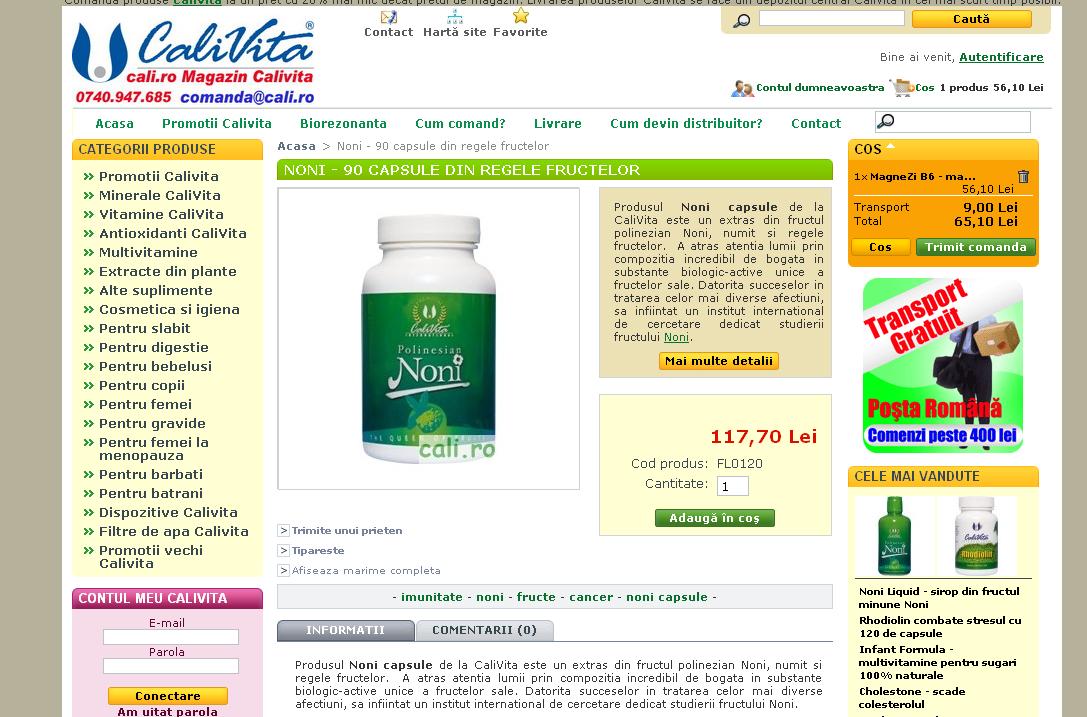 Cali.ro este un magazin online ce distribuie produse naturiste calivita reprezentând o reţea extinsă în peste 30 de ţări. Pe site-ul magazinului Cali.ro puteţi găsi o gamă largă de produse naturiste clasate pe foarte multe categorii; sunt astfel produse naturiste pentru slăbit, digestie, bebeluşi, copii, femei gravide, bărbaţi, bătrâni etc.