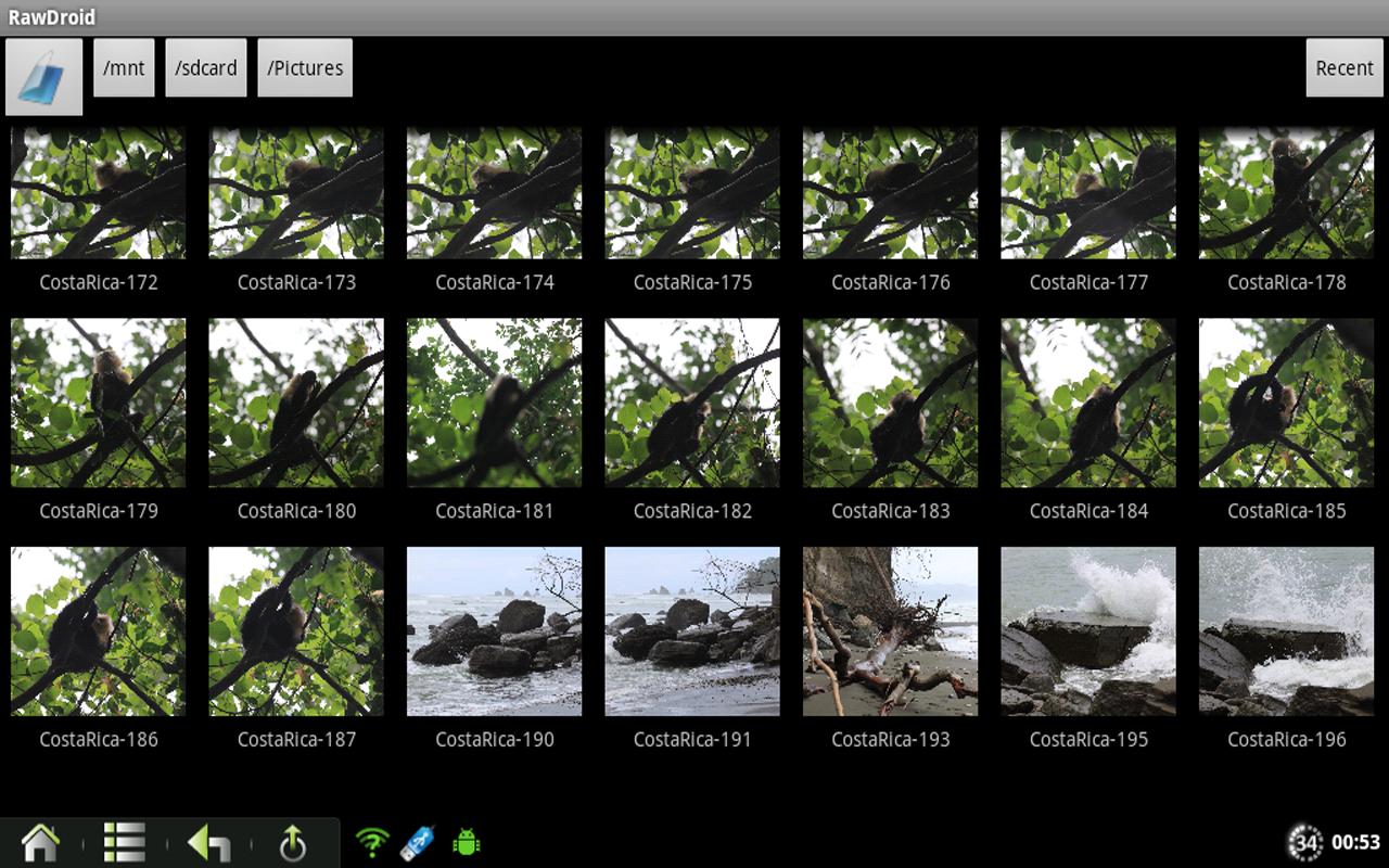 - RawDroid Demo – Programul se află încă la început și nu permite decodarea printr-o metodă cu o calitate ridicată a fotografiilor, însă permite extragerea JPEG-urilor din RAW-uri. Procedura e simplă. Deschideți fotografia dorită și intrați în meniul din dreapta sus, după care salvați fotografia în JPEG. Fotografia va fi salvată la rezoluție mare. Mie unul mi s-a părut că extrage mult mai bine fotografiile ca cel de-al doilea program, disponibil contracost.