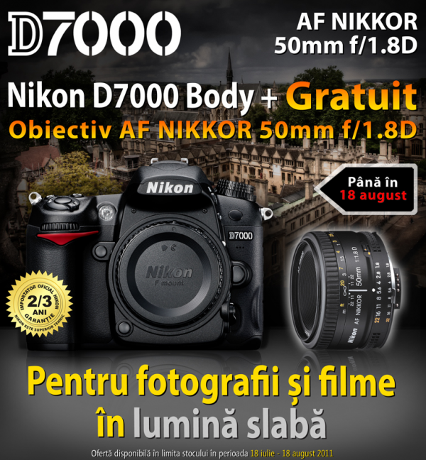 Acum puteți achiziționa de la distribuitorii Nikon pachetul format din Nikon D7000 și Nikkor AF-D 50mm f/1.8 la prețul de 4499 RON, beneficiind de o reducere de 500 RON. Click aici pentru a achiziționa acest pachet!