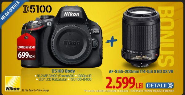 Unul dintre cele mai mișto D-SLR-uri pentru fotografii aflați la început de drum e acum la o promoție pe care eu unul n-aș rata-o. Nikon D5100, un aparat excelent, vine la pachet cu un teleobiectiv excelent pentru început (eu îl am de 2 ani și jumătate și m-a ajutat enorm de mult), Nikkor AF-S 55-200mm f/4-5.6 VR.