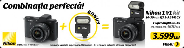 Făcând parte din noua gamă de aparate lansate în luna septembrie a anului trecut, Nikon 1 V1 alături de obiectivul de kit 10-30mm f/3.5-5.6 VR, primește acum o promoție excelentă. Alături de kit-ul de bază veți primi acum, gratuit, blițul Speedlight SB-N5, având astfel o reducere de 600 de lei.