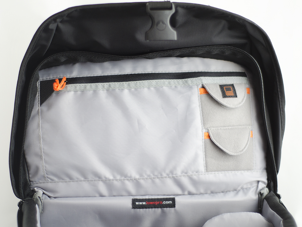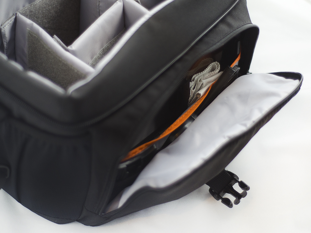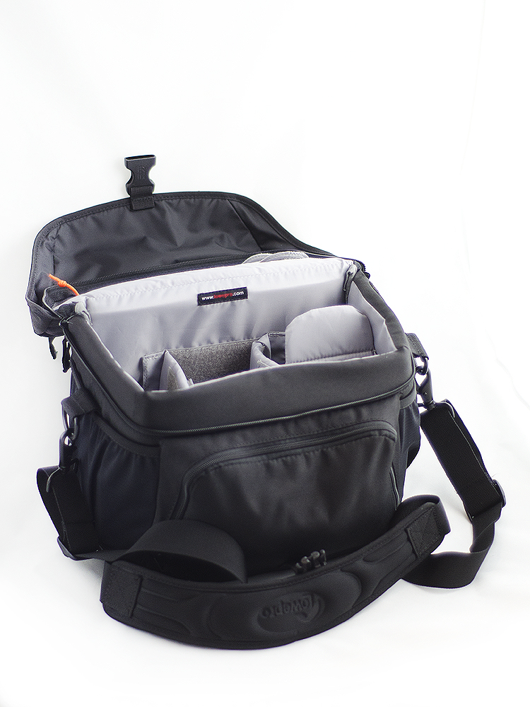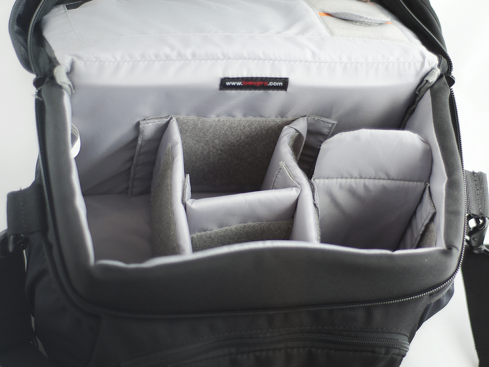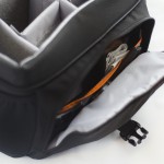 - este foarte încăpătoare – am reuşit să aşez în ea un Nikon D7000, 18-55, 55-200 VR, 50 1.8, SB-600, triggere, filtre şi alte accesorii (mai încap încă 2 obiective sau 3 suprapuse + multe alte accesorii)