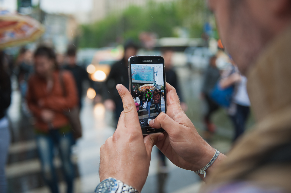 Dorind să fotografieze o doamnă care tocmai traversa cu umbrela în ploaie, Cătălin a fotografiat-o rapid cu noul Samsung Galaxy S5. Telefonu-i rezistent la apă, așa că ploaia nu l-a afectat deloc. Dar vă zic sincer, tare, tare zdravăn ploua. În timpul ăsta ne-am continuat drumul prin Romană, așteptând iar preț de câteva minute sub coloane să se mai liniștească ploaia.