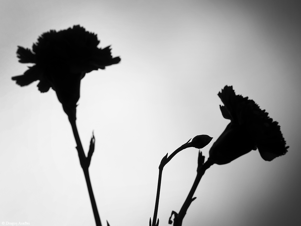În fotografiile de mai jos veți vedea forma întreagă a florilor, forma naturală, fără a vi se distrage atenția de anumite detalii pe care le puteți regăsi în multe alte fotografii. Voi publica în fiecare săptămână patru fotografii din această serie. Începem acum cu o garoafă a cărei siluetă devine extrem de interesantă în momentul în care se face rabat de la orice fel de detaliu.