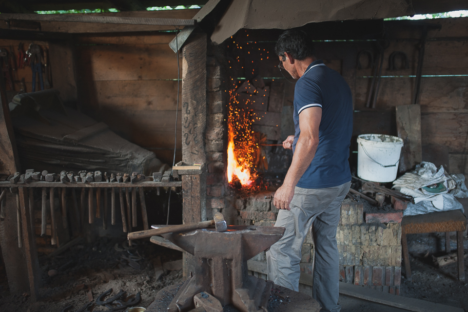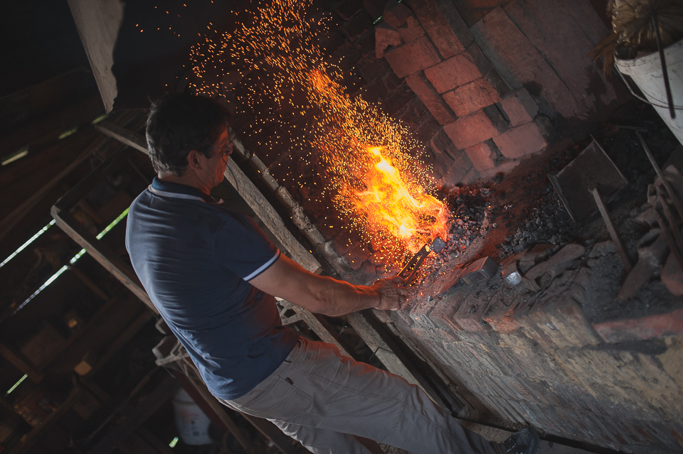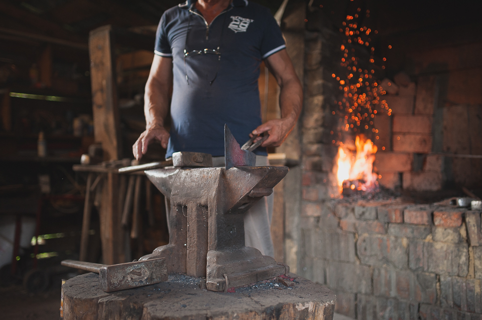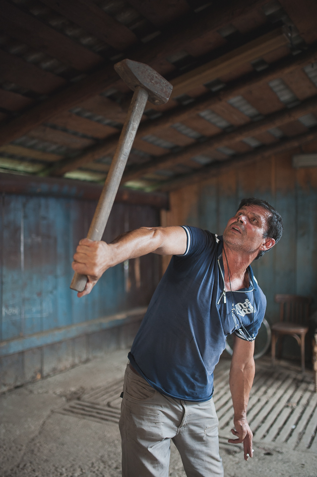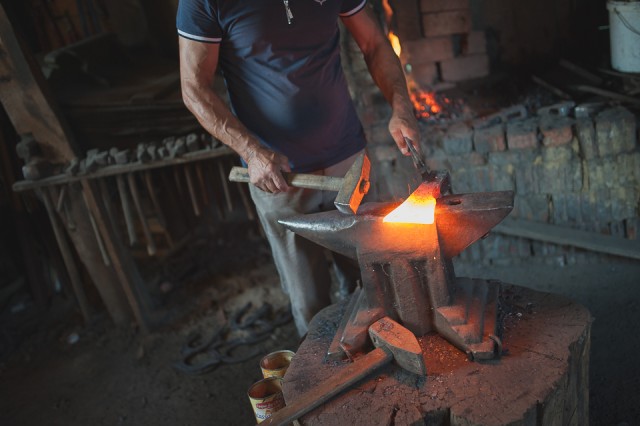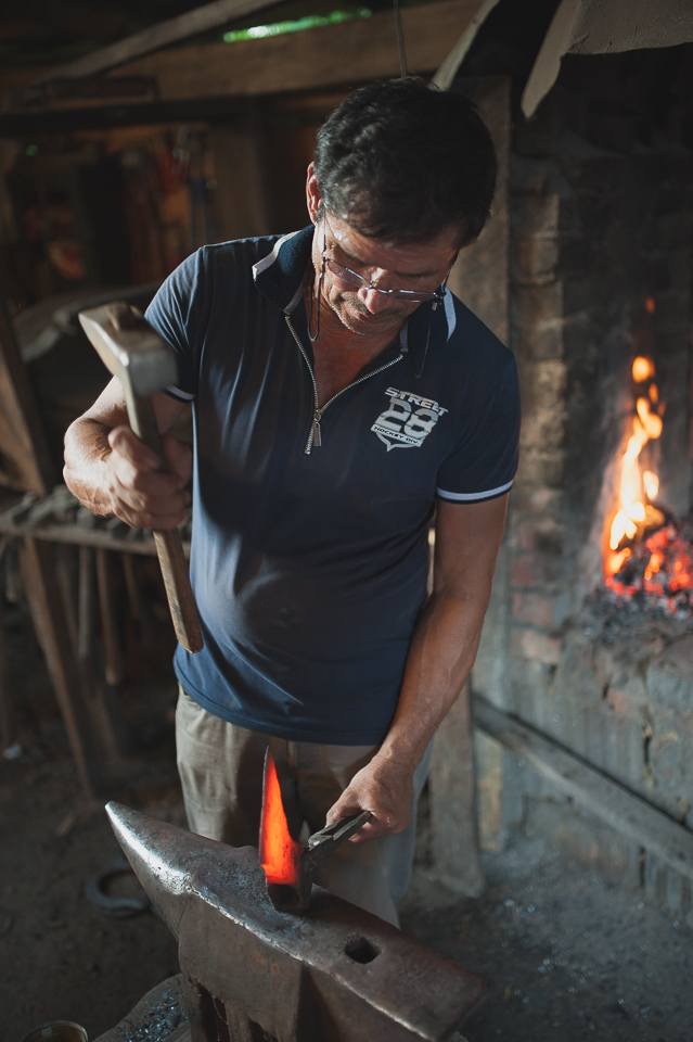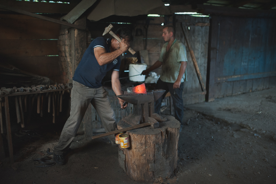 Vă rog să-l priviți și să vedeți ce brațe și se forță are. Barosul cu care lovește fierul, cel mic, are peste 3 kilograme. Și face asta toată ziua. De dimineață și până seara.
