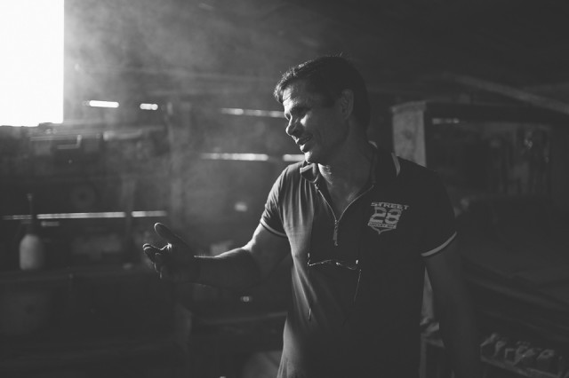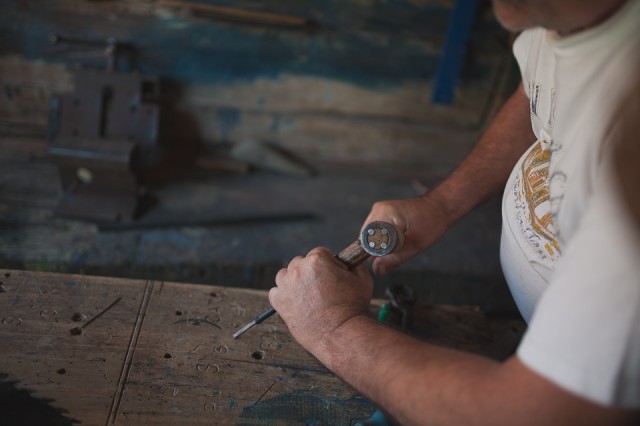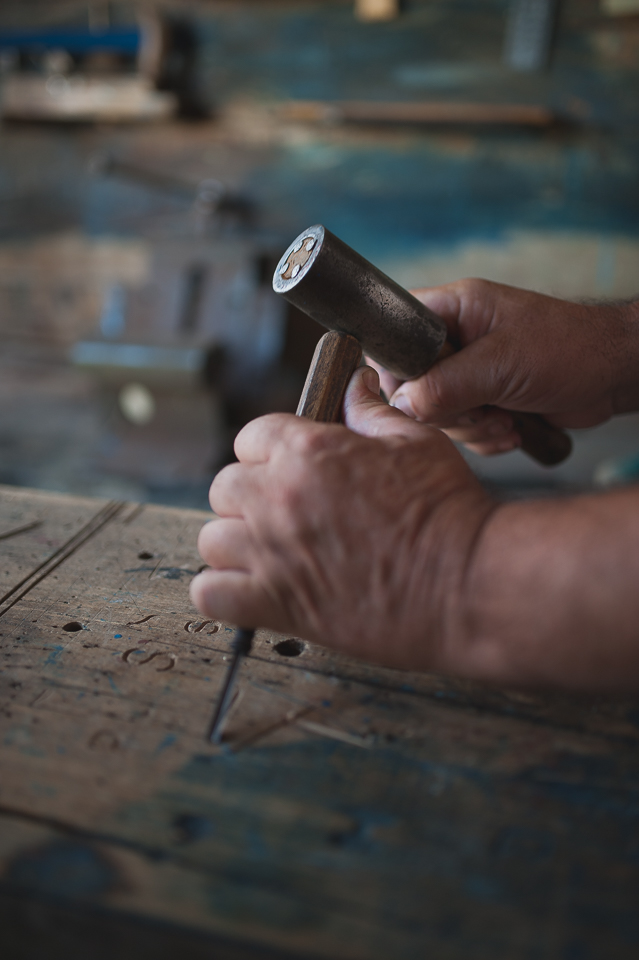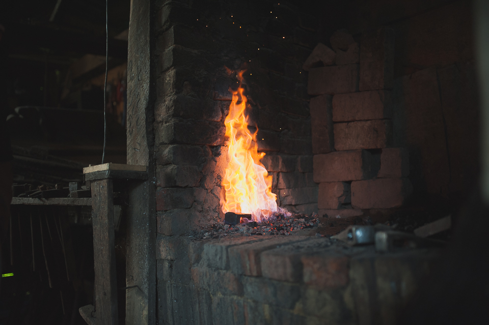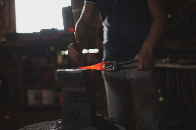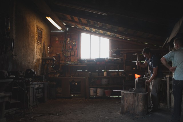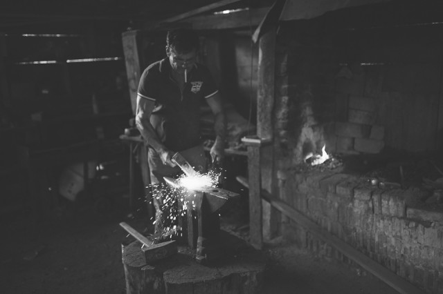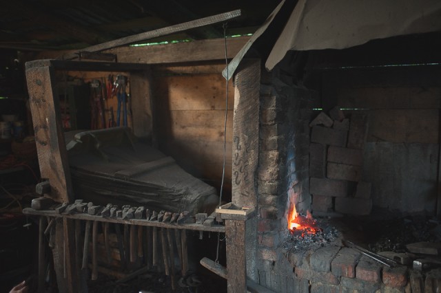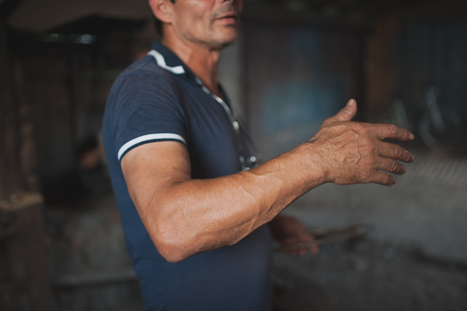 Vă rog să-l priviți și să vedeți ce brațe și se forță are. Barosul cu care lovește fierul, cel mic, are peste 3 kilograme. Și face asta toată ziua. De dimineață și până seara.