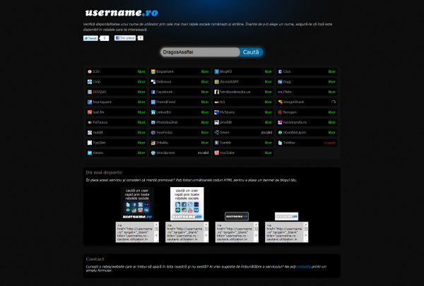 Cel mai bine ar fi să alegem un nume de utilizator identic la toate, însă verificând manual acest lucru veți pierde foarte mult timp. Pentru asta a fost creeat username.ro. Ce face acest site? Cu ce vă poate ajuta? Scriindu-vă numele dorit veți afla, în mai puțin de 5 secunde, disponibilitatea acestuia pe fiecare dintre rețelele de socializare din momentul de față.