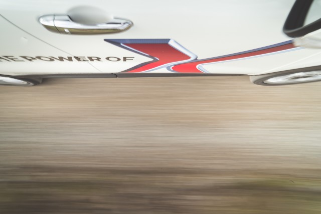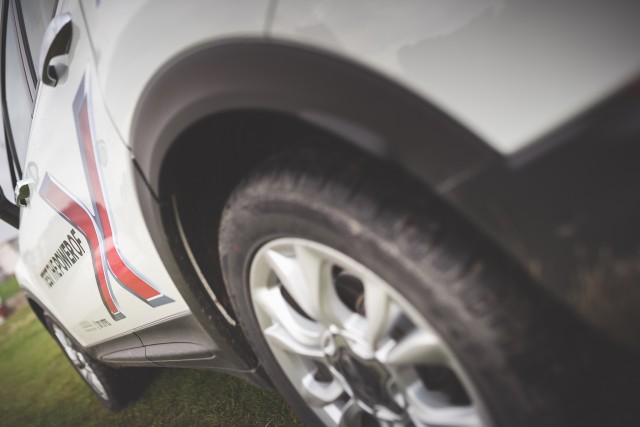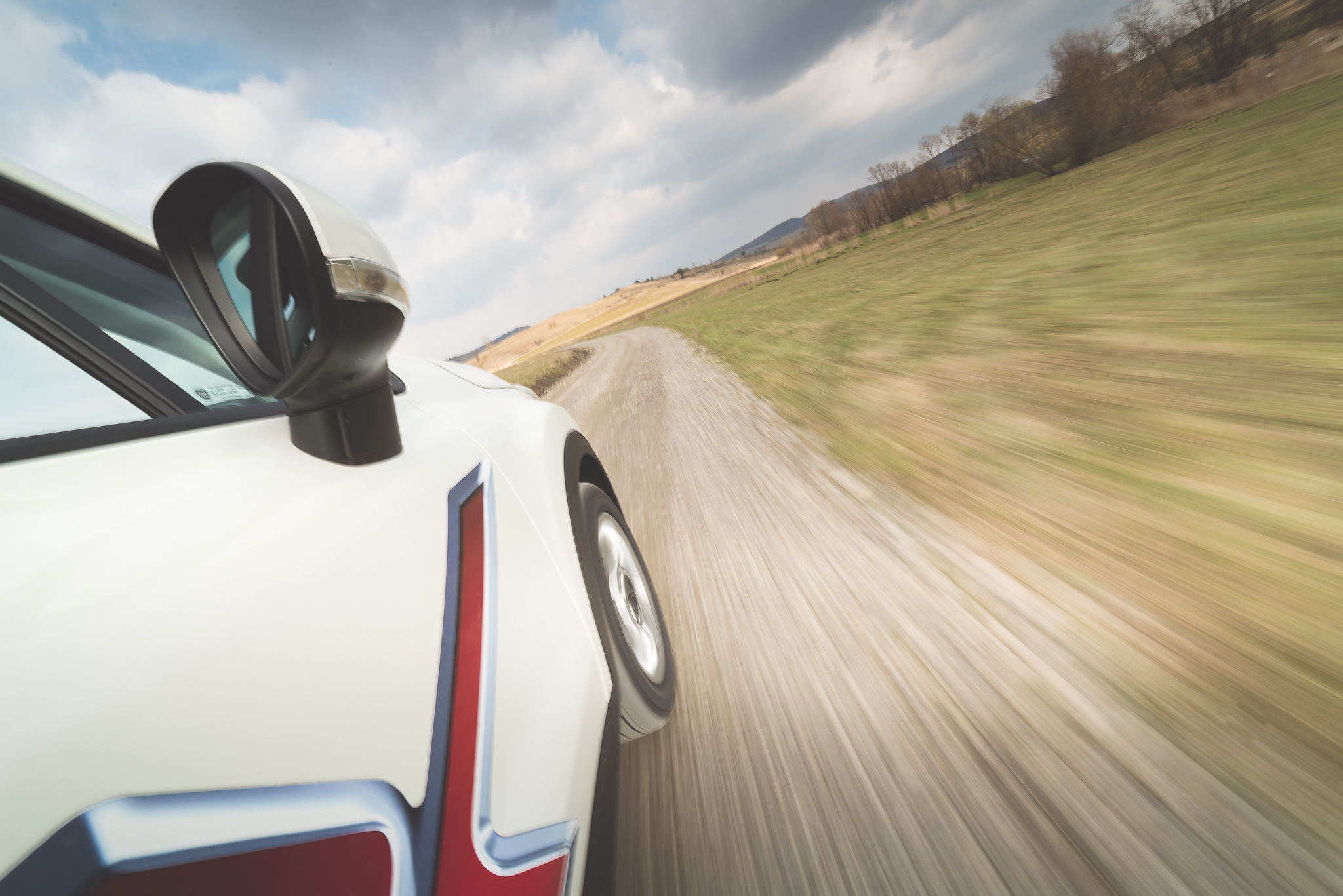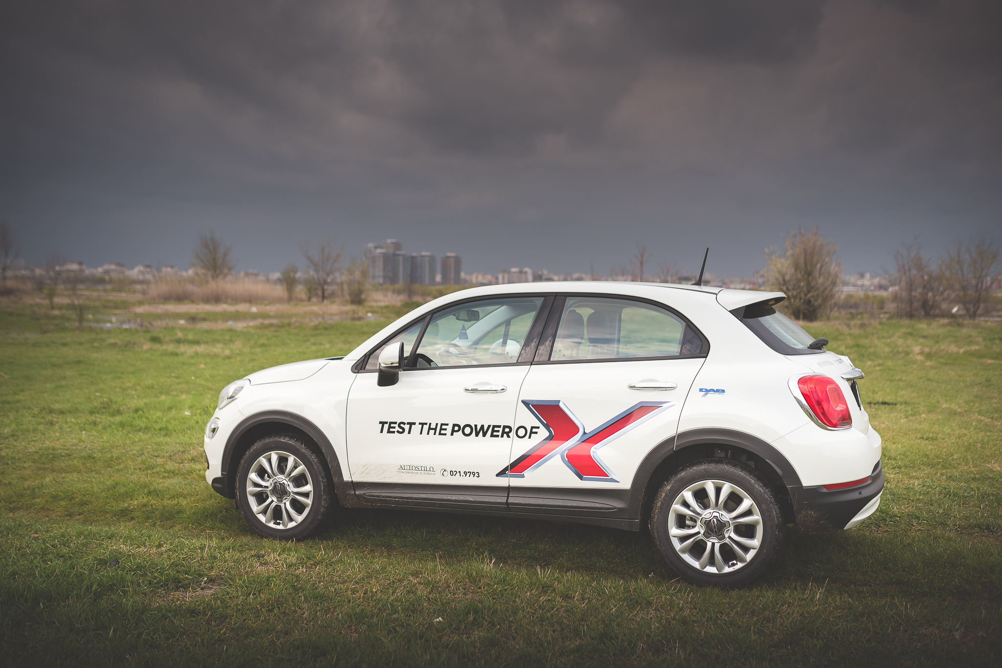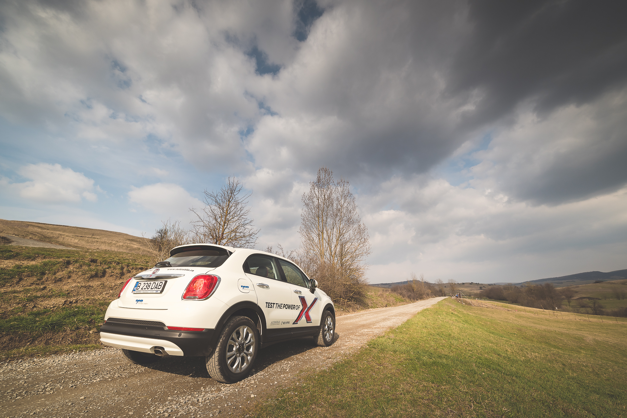 Așa că am pornit cu o oarecare reticiență la volanul noului 500X. Asta până am ajuns în primul loc în care am fotografiat mașina, după ce jumătate de zi plouase în continuu. Parchez mașina așa cum aveam în gând să o fotografiez, fac o serie de cadre de exterior, iar apoi trec să prind câteva detalii – asupra cărora revin puțin mai târziu – din interior. Aproape o oră mai târziu terminam și porneam mai departe. Am ajuns însă, fără să vreau, de pe iarbă într-o baltă noroioasă. Nu mai aveam altă variantă decât să trec prin ea. Am mers fără probleme, cu gândul că după ce trec dau de același teren care-i dădea mașinii aderența suficientă să ies ușor din zona în care făcusem fotografiile. Însă am dat de-o bucată bună de noroi afânat, adânc cât să-ți intre piciorul mai sus de gleznă.