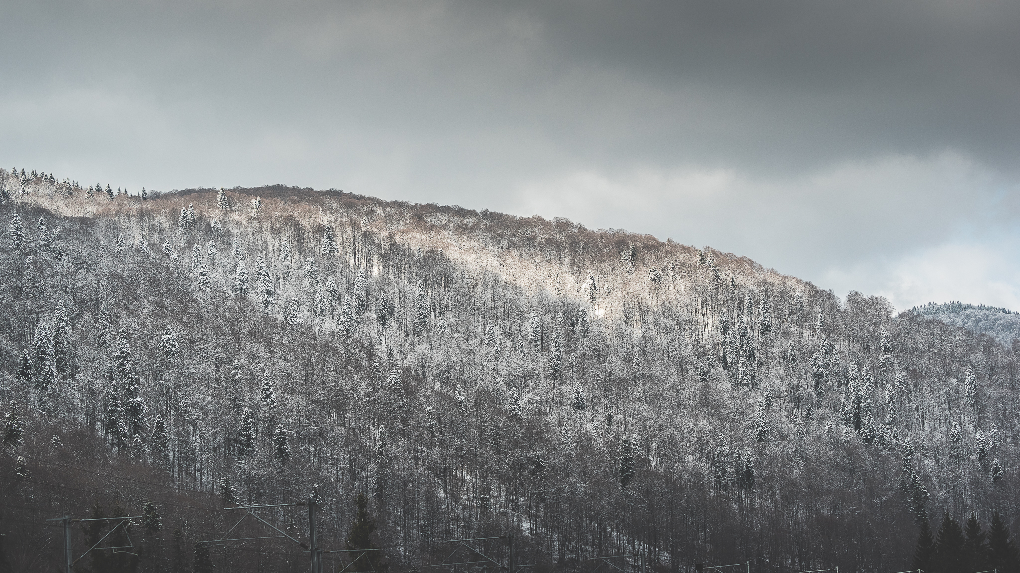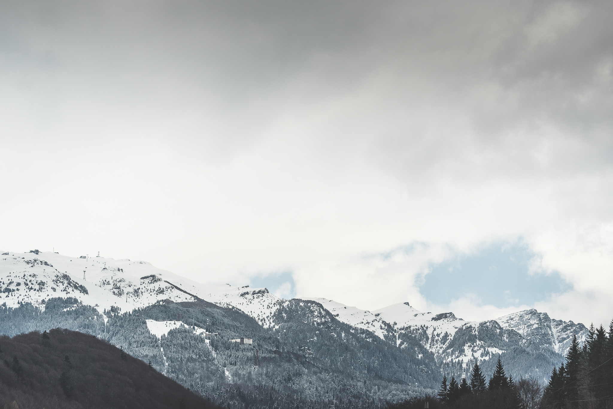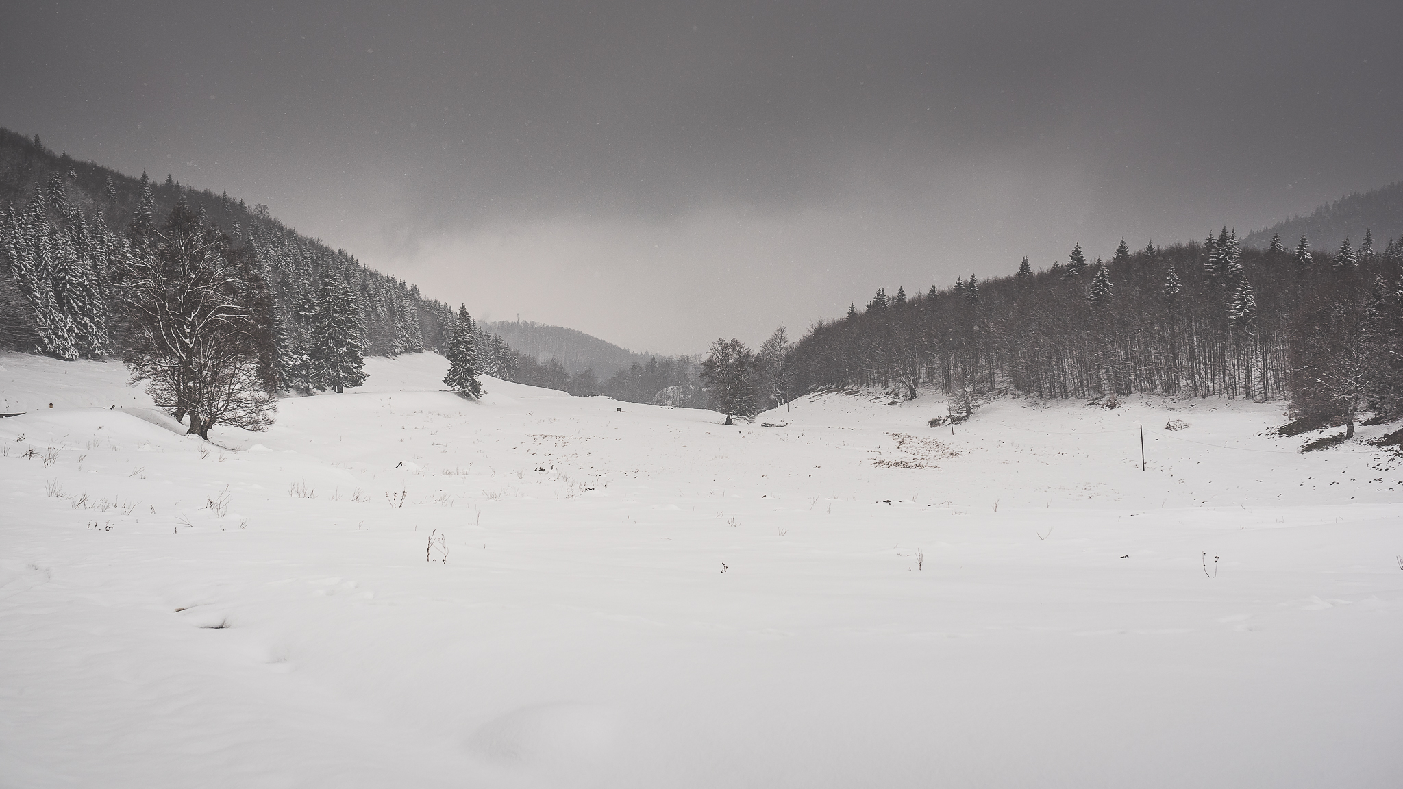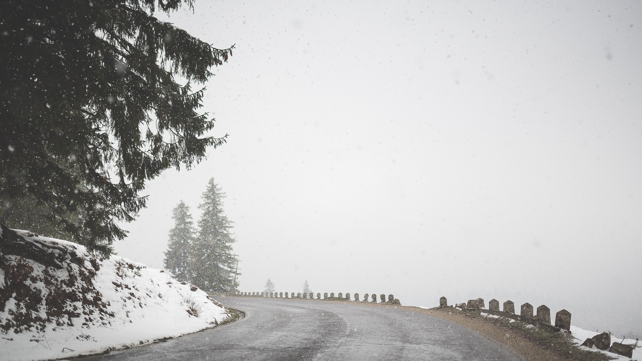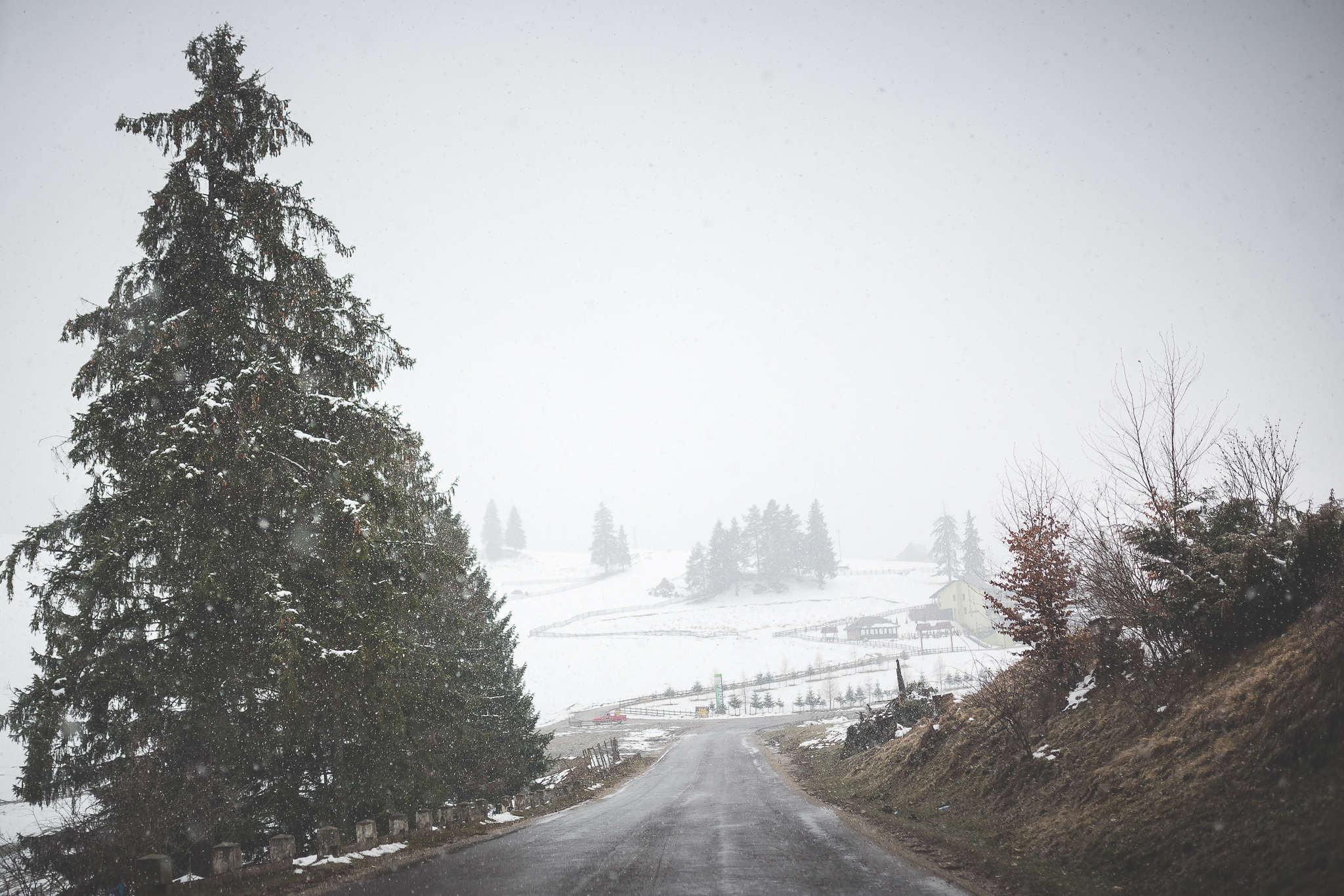 La întoarcerea spre București am ales traseul pe culoarul Rucăr – Bran, unde-mi doream să ajung de mult și unde-mi imaginam c-o să pot fotografia peisajul frumos pe care-l tot văzusem în imagini. N-a fost să fie așa. Am prins o ploaie mocănească pe tot drumul – deasă de n-am văzut nimic în stânga ori în dreapta drumului – și la un moment dat o ninsoare zdravănă, prilej cu care am reușit să fac și… singurele fotografii de pe traseu. În condițiile astea, mă bucur c-am putut să le fac și pe ele. Am să revin însă cu o altă ocazie, că sunt convins că pe vreme bună e-un drum minunat de frumos.