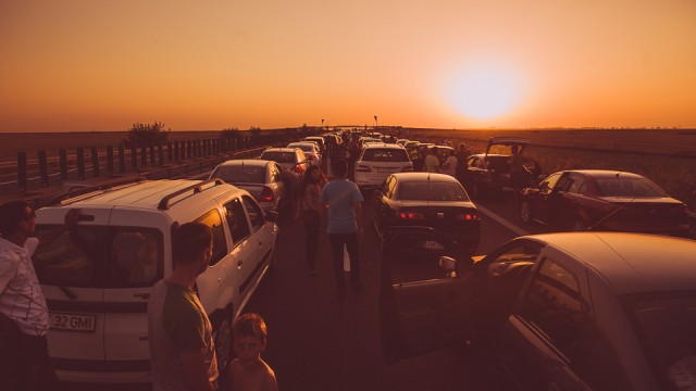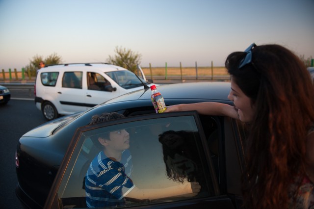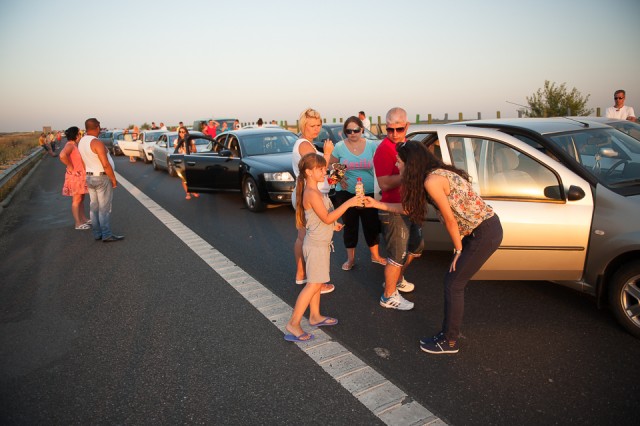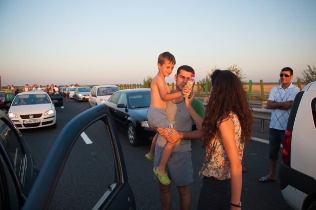 Am continuat apoi ziua cu încă două ore de plajă și bălăceală în apă, iar pe la 6 după-masa am pornit spre București. A început astfel cel mai lung drum pe care l-am avut până acum de la Constanța și până în București. Am făcut vreo 4 ore și jumătate din cauza unui incendiu de miriște care a blocat traficul. S-a întâmplat în timp ce eram pe autostradă și n-am mai avut acces la altă ieșire, motiv pentru care am așteptat în trafic. Dar am profitat de asta ca să-i servim pe cei care erau în jurul nostru cu ultimele sticle Lipton pe care le mai aveam la noi, dar și cu apa care ne mai rămăsese. Ne-am bucurat de bucuria lor, mai ales că o parte dintre sticle erau încă reci. 🙂