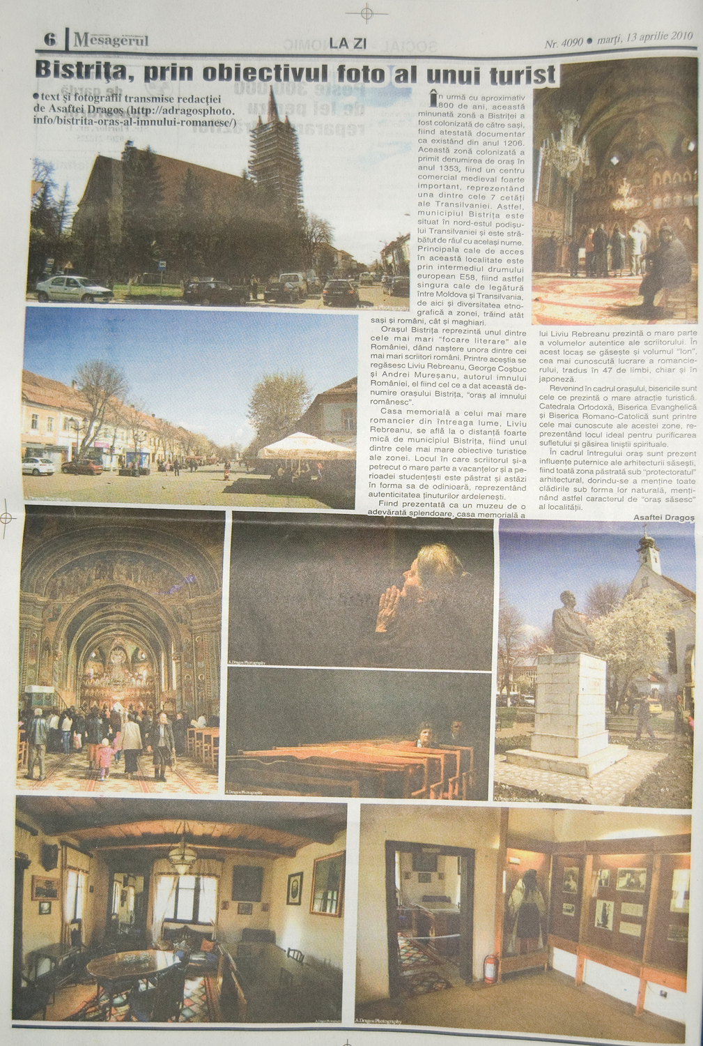 În urma realizării fotoreportajului despre oraşul Bistriţa şi împrejurimile acestuia, ziarul „Mesagerul” din judeţul cu acelaşi nume a publicat articololul, rezervând o pagină întreagă acestui scop.